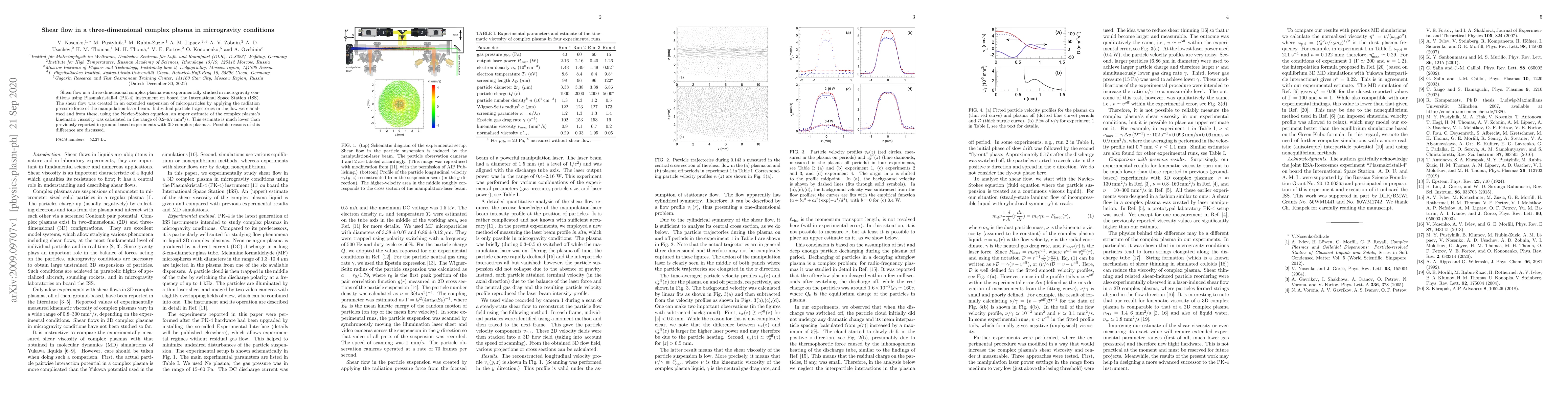 This study experimentally investigates shear flow in a three-dimensional complex plasma in microgravity aboard the ISS using PK-4. The kinematic viscosity was estimated to be significantly lower than ground-based values, suggesting different dynamics in microgravity.