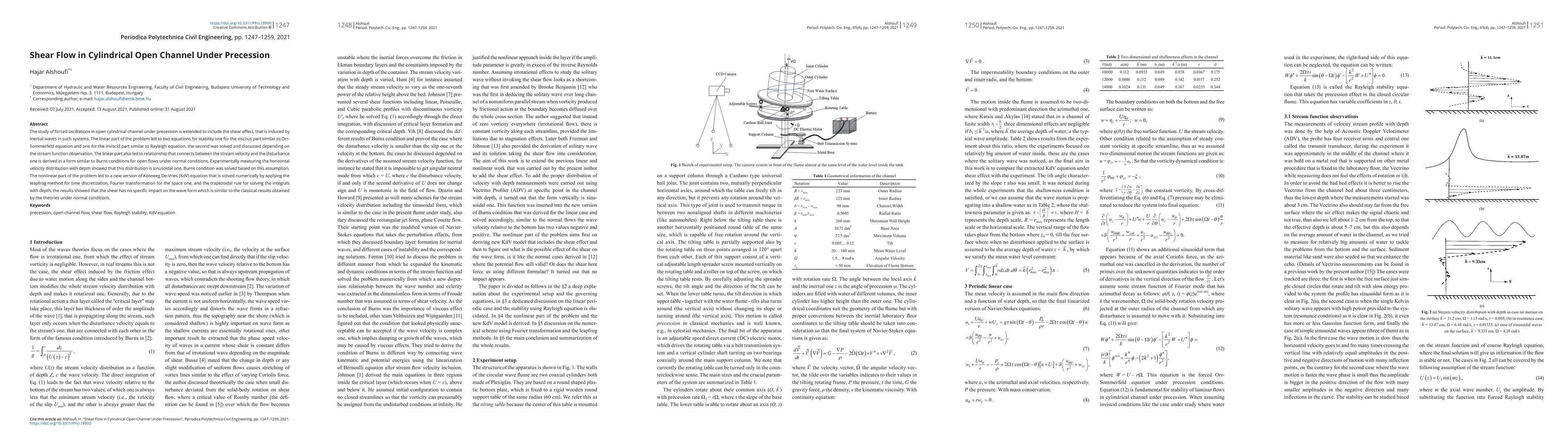The study of forced oscillations in open cylindrical channel under precession is extended to include the shear effect, that is induced by inertial waves in such systems. The linear part of the problem led to two equations for stability one for the viscous part similar to Orr- Sommerfeld equation and one for the inviscid part similar to Rayleigh equation, the second was solved and discussed depending on the stream function observation. The linear part also led to relationship that connects between the stream velocity and the disturbance one is derived in a form similar to Burns conditions for open flows under normal conditions. Experimentally measuring the horizontal velocity distribution with depth showed that this distribution is sinusoidal one. Burns condition was solved based on this assumption. The nonlinear part of the problem led to a new version of Koteweg De-Vries (KdV) equation that is solved numerically by applying the leapfrog method for time discretization, Fourier transformation for the space one, and the trapezoidal rule for solving the integrals with depth, the results showed that the shear has no specific impact on the wave form which is similar to the classical results obtained by the theories under normal conditions.