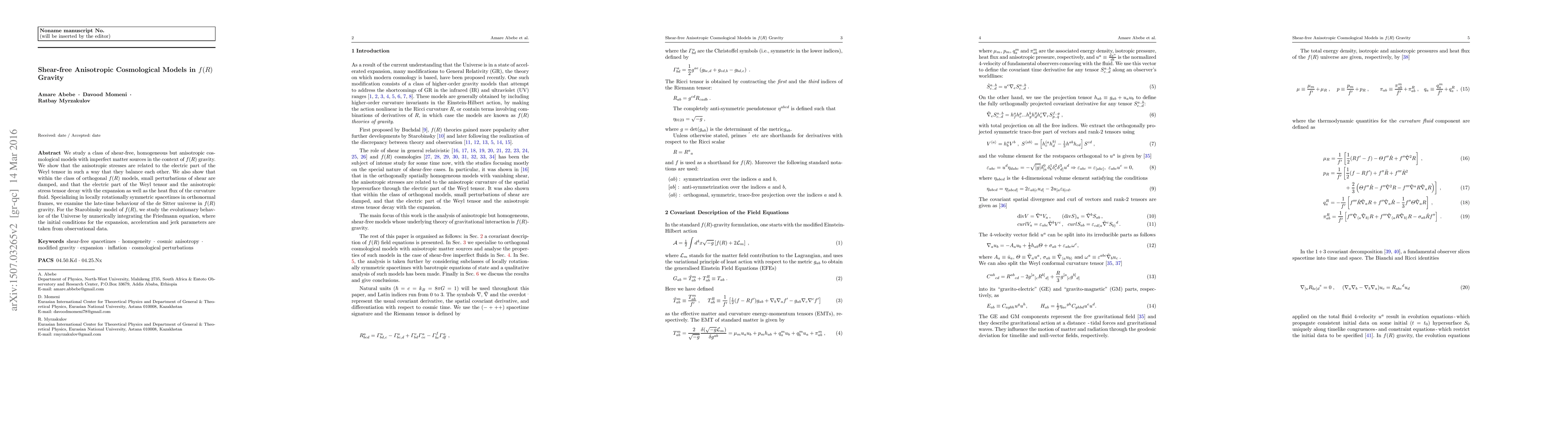 We study a class of shear-free, homogeneous but anisotropic cosmological models with imperfect matter sources in the context of f(R) gravity. We show that the anisotropic stresses are related to the electric part of the Weyl tensor in such a way that they balance each other. We also show that within the class of orthogonal f(R) models, small perturbations of shear are damped, and that the electric part of the Weyl tensor and the anisotropic stress tensor decay with the expansion as well as the heat flux of the curvature fluid. Specializing in locally rotationally symmetric spacetimes in orthonormal frames, we examine the late-time behaviour of the de Sitter universe in $f(R)$ gravity. For the Starobinsky model of f(R), we study the evolutionary behavior of the Universe by numerically integrating the Friedmann equation, where the initial conditions for the expansion, acceleration and jerk parameters are taken from observational data.