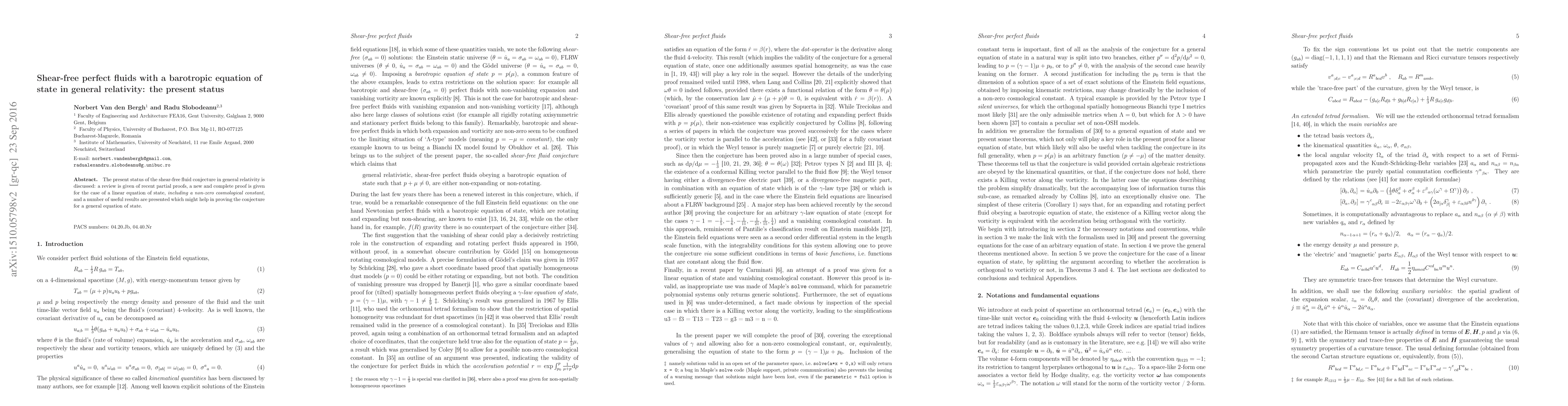 The present status of the shear-free fluid conjecture in general relativity is discussed: a review is given of recent partial proofs, a new and complete proof is given for the case of a linear equation of state, including a non-zero cosmological constant, and a number of useful results are presented which might help in proving the conjecture for a general equation of state.