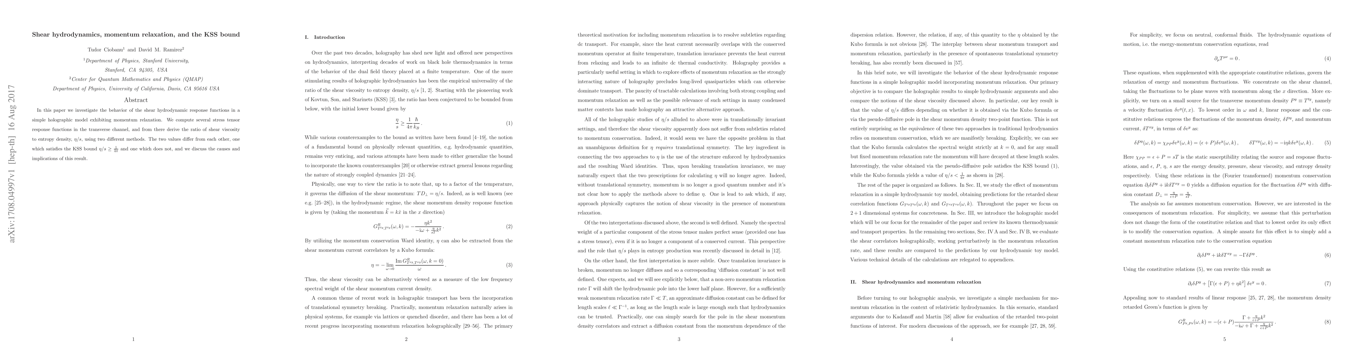 Researchers investigate the behavior of shear hydrodynamic response functions in a holographic model with momentum relaxation, finding two conflicting values for the ratio of shear viscosity to entropy density that satisfy or violate the KSS bound.
