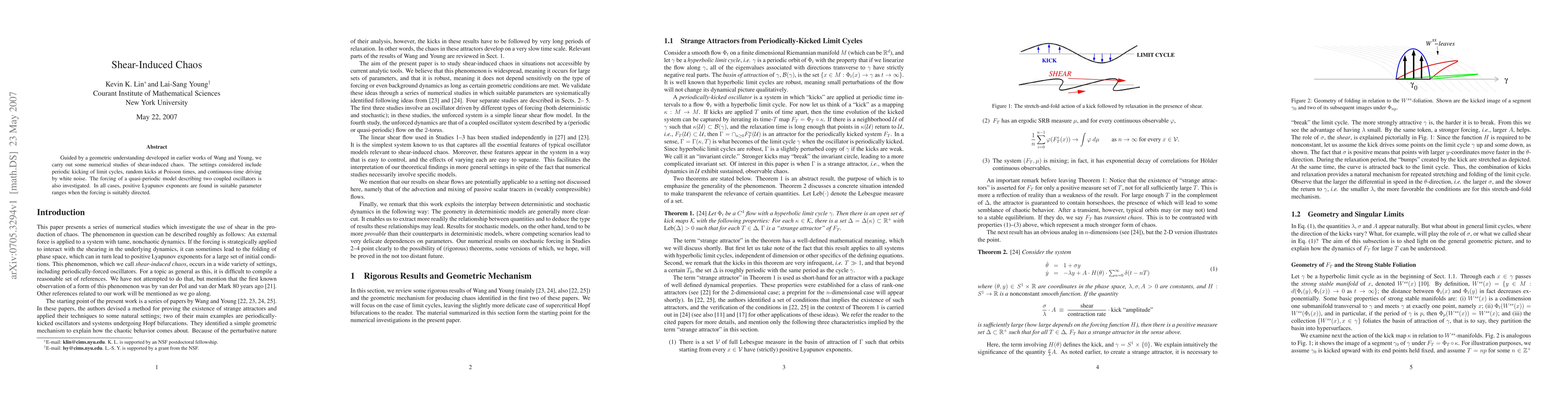 Guided by a geometric understanding developed in earlier works of Wang and Young, we carry out some numerical studies of shear-induced chaos. The settings considered include periodic kicking of limit cycles, random kicks at Poisson times, and continuous-time driving by white noise. The forcing of a quasi-periodic model describing two coupled oscillators is also investigated. In all cases, positive Lyapunov exponents are found in suitable parameter ranges when the forcing is suitably directed.