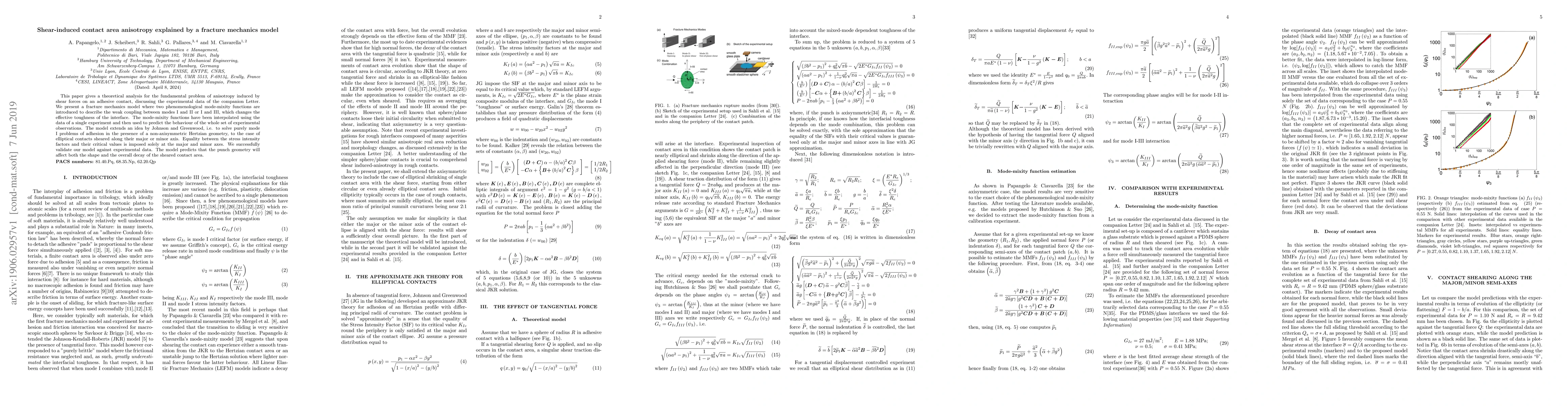 This paper gives a theoretical analysis for the fundamental problem of anisotropy induced by shear forces onan adhesive contact, discussing the experimental data of the companion Letter. We present a fracture mechanicsmodel where two phenomenological mode-mixity functions are introduced to describe the weak couplingbetween modes I and II or I and III, which changes the effective toughness of the interface. The mode-mixityfunctions have been interpolated using the data of a single experiment and then used to predict the behavior of thewhole set of experimental observations. The model extends an idea by Johnson and Greenwood, to solve purelymode I problems of adhesion in the presence of a nonaxisymmetric Hertzian geometry, to the case of ellipticalcontacts sheared along their major or minor axis. Equality between the stress intensity factors and their criticalvalues is imposed solely at the major and minor axes. We successfully validate our model against experimentaldata. The model predicts that the punch geometry will affect both the shape and the overall decay of the shearedcontact area.