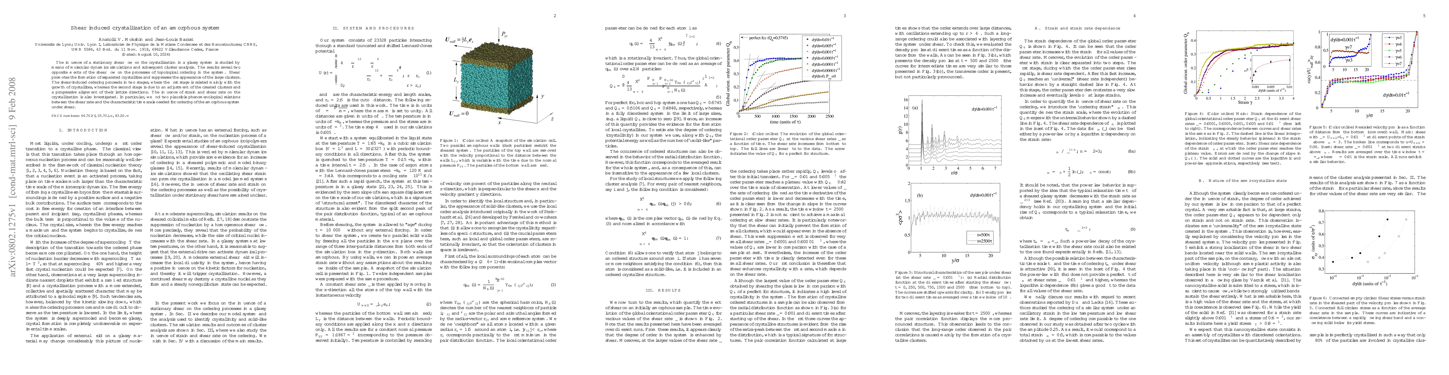 This study investigates the effects of stationary shear flow on crystallization in a glassy amorphous system using molecular dynamics simulations. The findings show that shear promotes the formation of separate crystallites while suppressing large clusters, with two-stage ordering: initial crystallite growth followed by cluster adjustment and alignment. The research also explores the influence of strain and shear rate on these processes.
