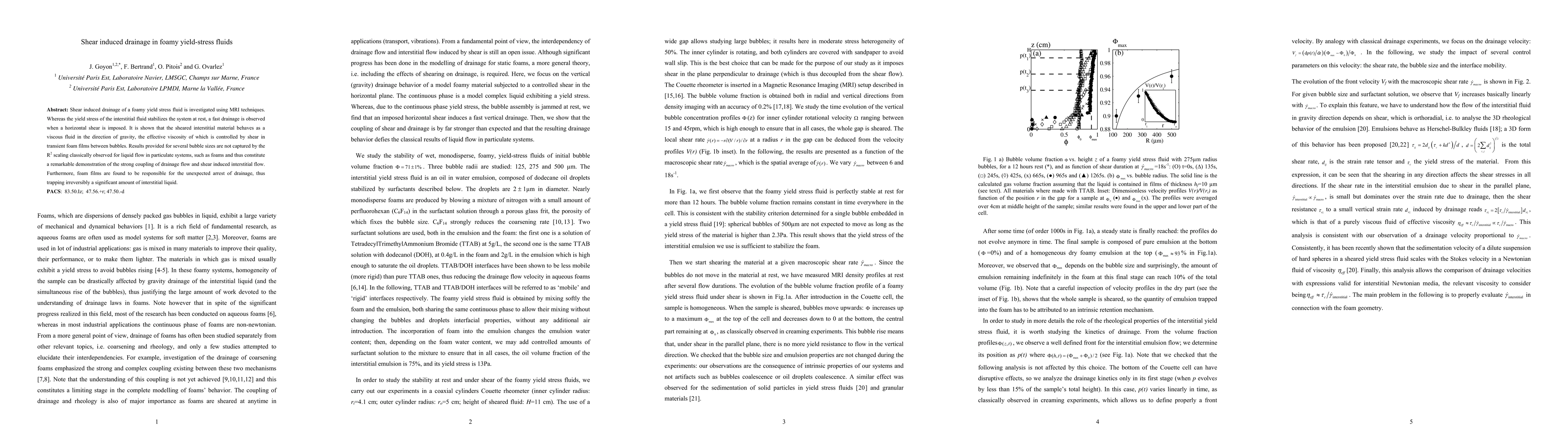 This study investigates the shear-induced drainage in foamy yield-stress fluids using MRI techniques, revealing that shear causes rapid drainage despite the yield stress. The interstitial fluid behaves viscously under gravity, with its effective viscosity modulated by shear in transient foam films, challenging classical R^2 scaling laws for liquid flow in particulate systems.