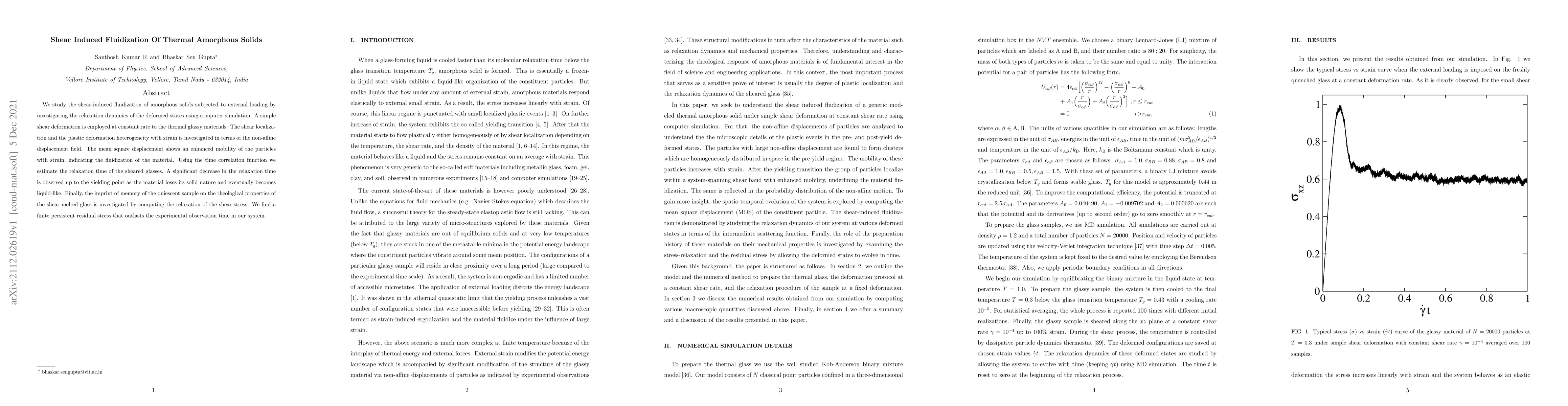 This paper investigates the shear-induced fluidization of amorphous solids through computer simulations, revealing enhanced particle mobility and a significant decrease in relaxation time as the material transitions from solid to liquid-like states. It also finds a persistent residual stress that remains after the material has been shear melted.