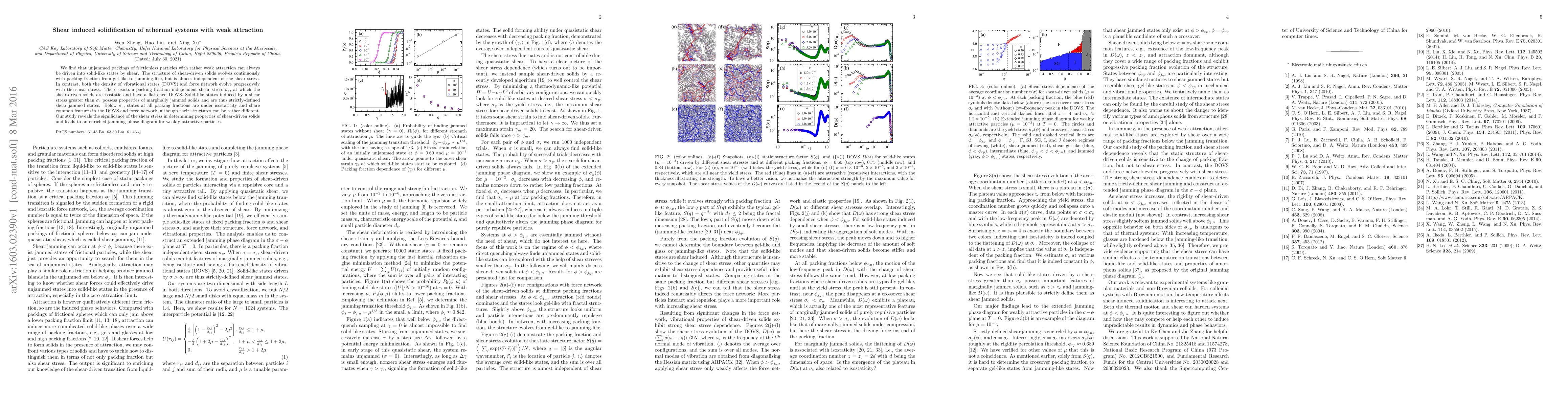 We find that unjammed packings of frictionless particles with rather weak attraction can always be driven into solid-like states by shear. The structure of shear-driven solids evolves continuously with packing fraction from gel-like to jamming-like, but is almost independent of the shear stress. In contrast, both the density of vibrational states (DOVS) and force network evolve progressively with the shear stress. There exists a packing fraction independent shear stress $\sigma_c$, at which the shear-driven solids are isostatic and have a flattened DOVS. Solid-like states induced by a shear stress greater than $\sigma_c$ possess properties of marginally jammed solids and are thus strictly-defined shear jammed states. Below $\sigma_c$, states at all packing fractions are under isostaticity and share common features in the DOVS and force network, although their structures can be rather different. Our study reveals the significance of the shear stress in determining properties of shear-driven solids and leads to an enriched jamming phase diagram for weakly attractive particles.