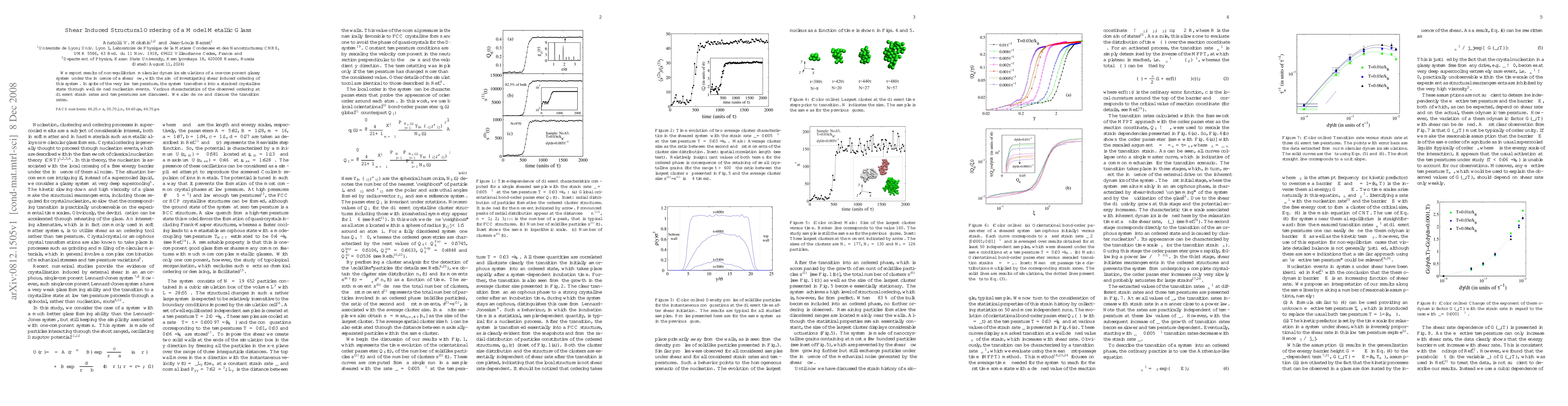 We report results of non-equilibrium molecular dynamics simulations of a one-component glassy system under the influence of a shear flow, with the aim of investigating shear induced ordering of this system. In spite of the very low temperature, the system transforms into a strained crystalline state through well defined nucleation events. Various characteristics of the observed ordering at different strain rates and temperatures are discussed. We also define and discuss the transition rates.
