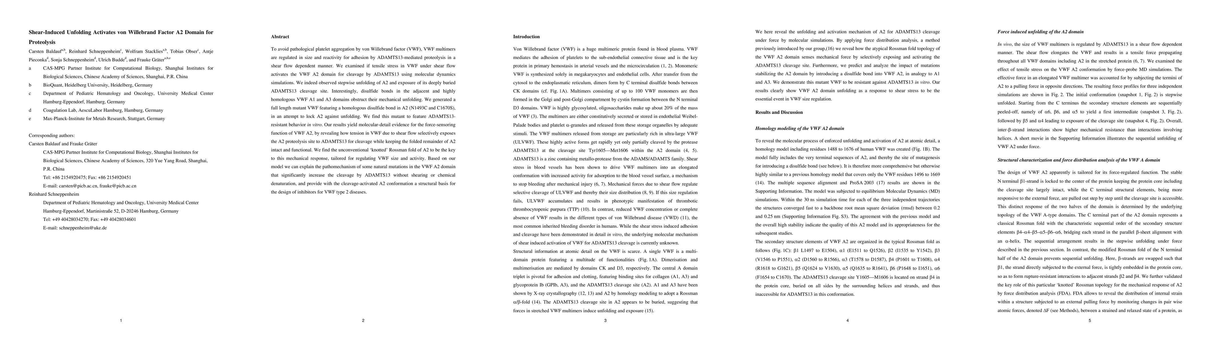 Research shows that shear stress unfolds von Willebrand factor A2 domain, exposing a cleavage site for ADAMTS13-mediated proteolysis, which regulates platelet aggregation. The study also proposes a structural basis for designing inhibitors to treat VWF type 2 diseases.