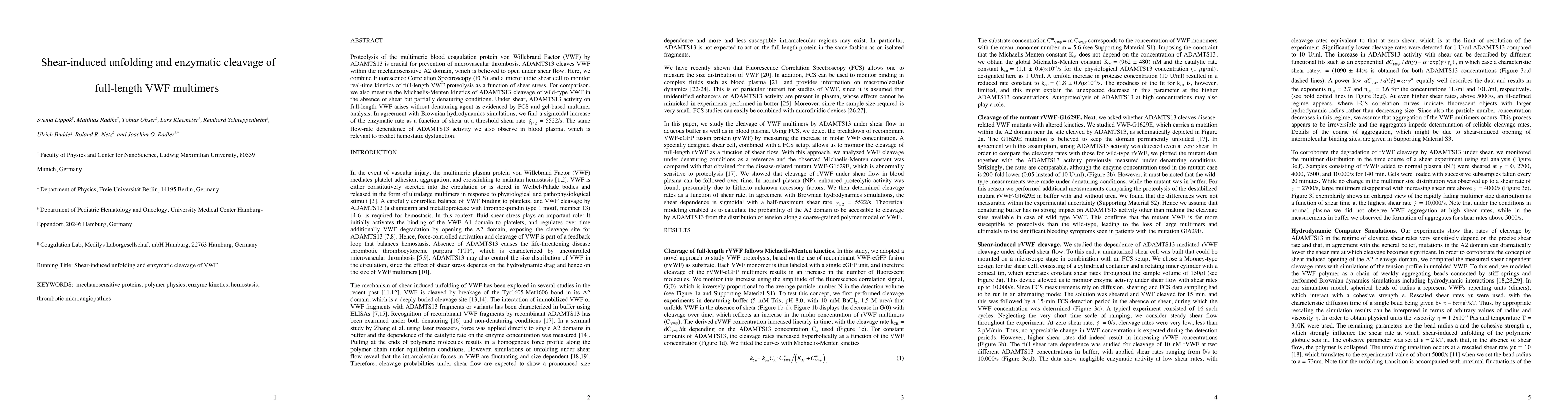 Proteolysis of the multimeric blood coagulation protein von Willebrand Factor (VWF) by ADAMTS13 is crucial for prevention of microvascular thrombosis. ADAMTS13 cleaves VWF within the mechanosensitive A2 domain, which is believed to open under shear flow. Here, we combine Fluorescence Correlation Spectroscopy (FCS) and a microfluidic shear cell to monitor real-time kinetics of full-length VWF proteolysis as a function of shear stress. For comparison, we also measure the Michaelis-Menten kinetics of ADAMTS13 cleavage of wild-type VWF in the absence of shear but partially denaturing conditions. Under shear, ADAMTS13 activity on full-length VWF arises without denaturing agent as evidenced by FCS and gel-based multimer analysis. In agreement with Brownian hydrodynamics simulations, we find a sigmoidal increase of the enzymatic rate as a function of shear at a threshold shear rate 5522/s. The same flow-rate dependence of ADAMTS13 activity we also observe in blood plasma, which is relevant to predict hemostatic dysfunction.