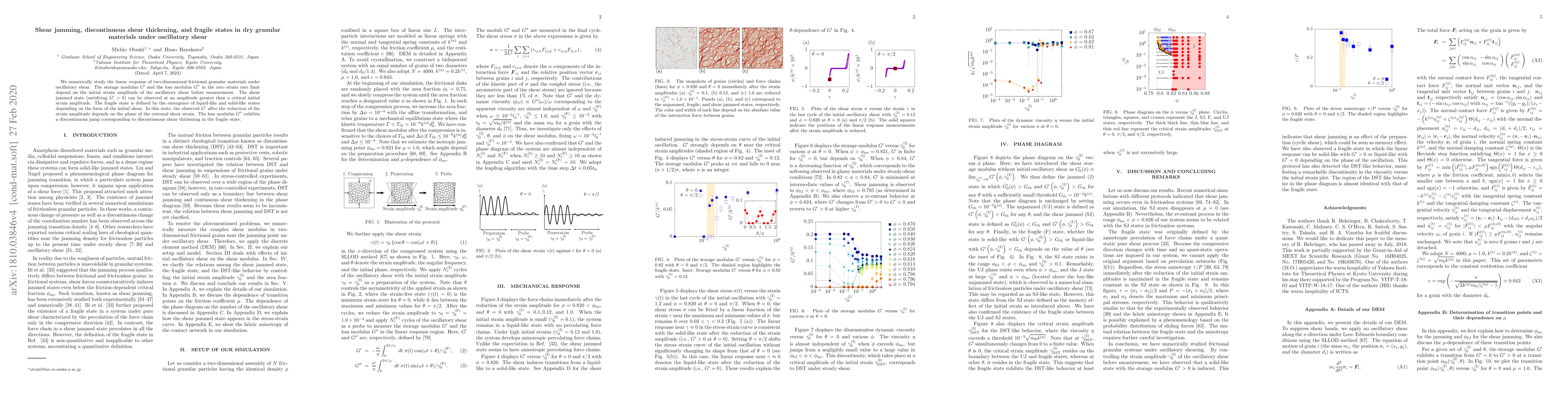 This paper investigates the dynamic behavior of two-dimensional frictional granular materials under oscillatory shear, revealing shear jamming and discontinuous shear thickening. The study finds that the material's response depends on the initial strain amplitude, leading to distinct fragile states characterized by varying storage and loss moduli.