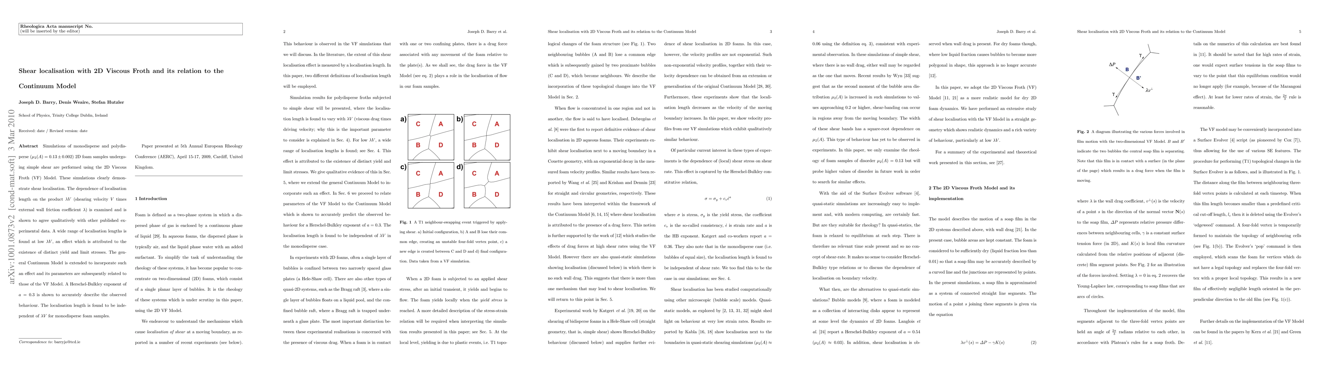 Simulations of monodisperse and polydisperse ($\mu_2(A)=0.13\pm0.002$) 2D foam samples undergoing simple shear are performed using the 2D Viscous Froth (VF) Model. These simulations clearly demonstrate shear localisation. The dependence of localisation length on the product $\lambda V$ (shearing velocity $V$ times external wall friction coefficient $\lambda$) is examined and is shown to agree qualitatively with other published experimental data. A wide range of localisation lengths is found at low $\lambda V$, an effect which is attributed to the existence of distinct yield and limit stresses. The general Continuum Model is extended to incorporate such an effect and its parameters are subsequently related to those of the VF Model. A Herschel-Bulkley exponent of $a=0.3$ is shown to accurately describe the observed behaviour. The localisation length is found to be independent of $\lambda V$ for monodisperse foam samples.