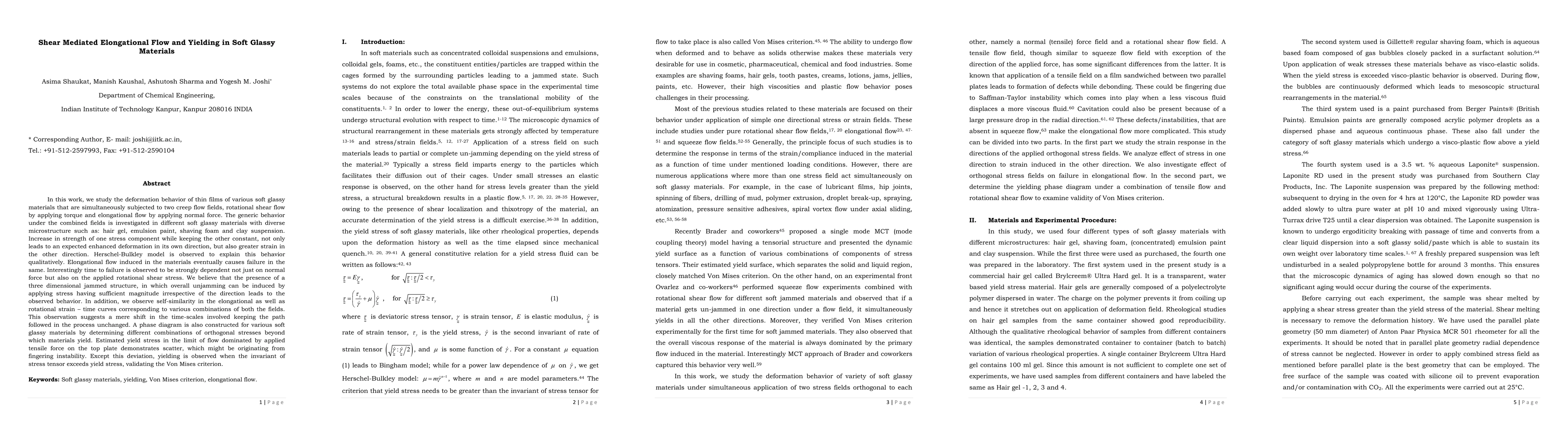In this work, we study the deformation behavior of thin films of various soft glassy materials that are simultaneously subjected to two creep flow fields, rotational shear flow by applying torque and elongational flow by applying normal force. The generic behavior under the combined fields is investigated in different soft glassy materials with diverse microstructure such as: hair gel, emulsion paint, shaving foam and clay suspension. Increase in strength of one stress component while keeping the other constant, not only leads to an expected enhanced deformation in its own direction, but also greater strain in the other direction. Herschel Bulkley model is observed to explain this behavior qualitatively. Elongational flow induced in the materials eventually causes failure in the same. Interestingly time to failure is observed to be strongly dependent not just on normal force but also on the applied rotational shear stress. We believe that the presence of a three dimensional jammed structure, in which overall unjamming can be induced by applying stress having sufficient magnitude irrespective of the direction leads to the observed behavior. In addition, we observe self-similarity in the elongational as well as rotational strain time curves corresponding to various combinations of both the fields. This observation suggests a mere shift in the time-scales involved keeping the path followed in the process unchanged. A phase diagram is also constructed for various soft glassy materials by determining different combinations of orthogonal stresses beyond which materials yield. Estimated yield stress in the limit of flow dominated by applied tensile force on the top plate demonstrates scatter, which might be originating from fingering instability. Except this deviation, yielding is observed when the invariant of stress tensor exceeds yield stress, validating the Von Mises criterion.