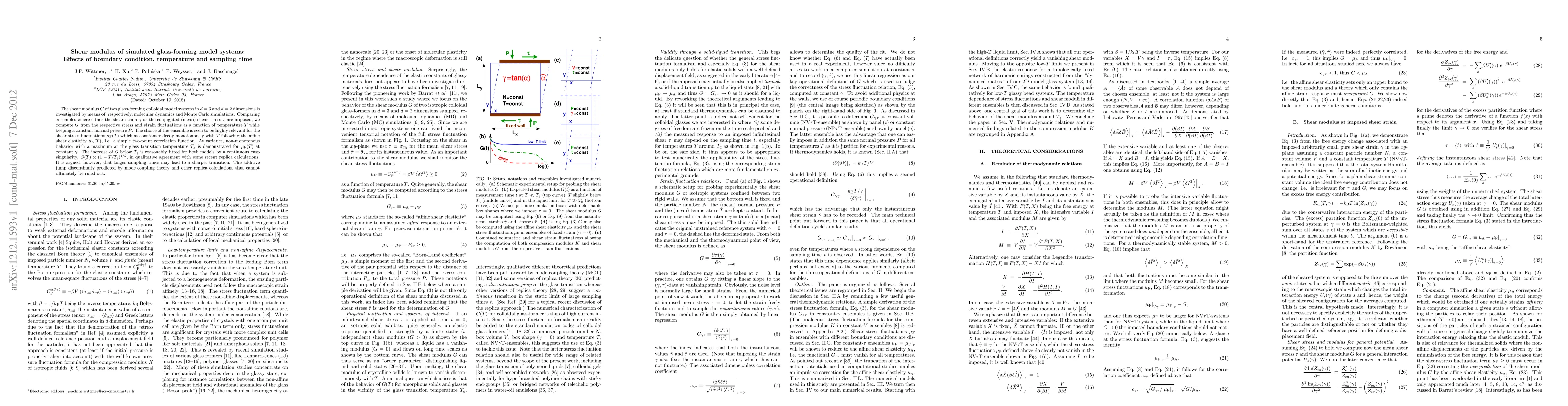This study investigates the shear modulus G of two colloidal glass-forming systems using molecular dynamics and Monte Carlo simulations. It finds that the choice of ensemble affects shear stress fluctuations, with non-monotonic behavior observed at the glass transition temperature T_g. The shear modulus shows a continuous cusp singularity proportional to (1-T/T_g)^(1/2), though longer sampling times might reveal a sharper transition.