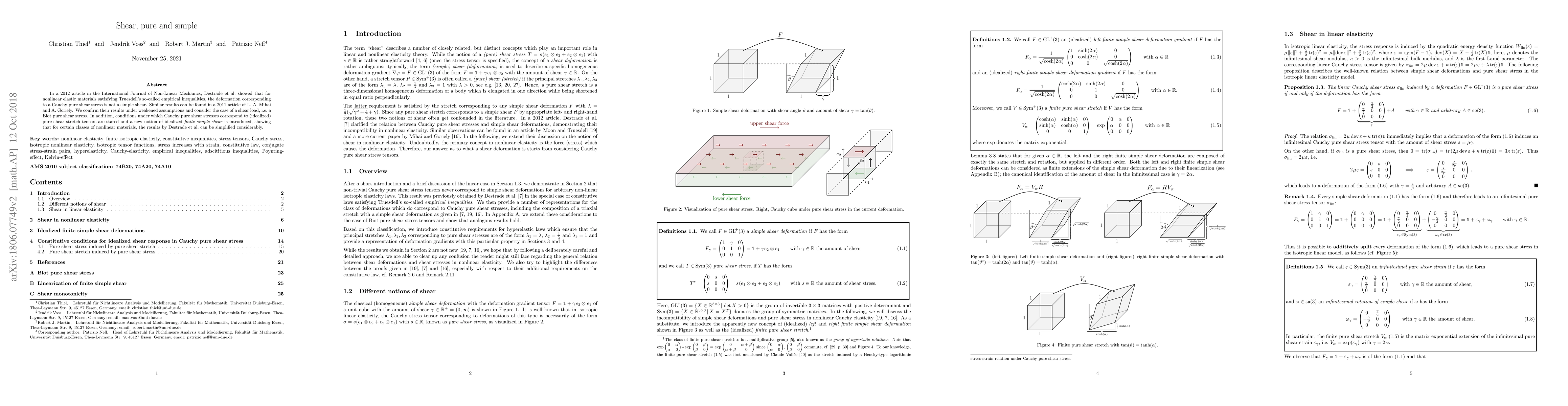 In a 2012 article in the International Journal of Non-Linear Mechanics, Destrade et al. showed that for nonlinear elastic materials satisfying Truesdell's so-called empirical inequalities, the deformation corresponding to a Cauchy pure shear stress is not a simple shear. Similar results can be found in a 2011 article of L. A. Mihai and A. Goriely. We confirm their results under weakened assumptions and consider the case of a shear load, i.e. a Biot pure shear stress. In addition, conditions under which Cauchy pure shear stresses correspond to (idealized) pure shear stretch tensors are stated and a new notion of idealized finite simple shear is introduced, showing that for certain classes of nonlinear materials, the results by Destrade et al. can be simplified considerably.