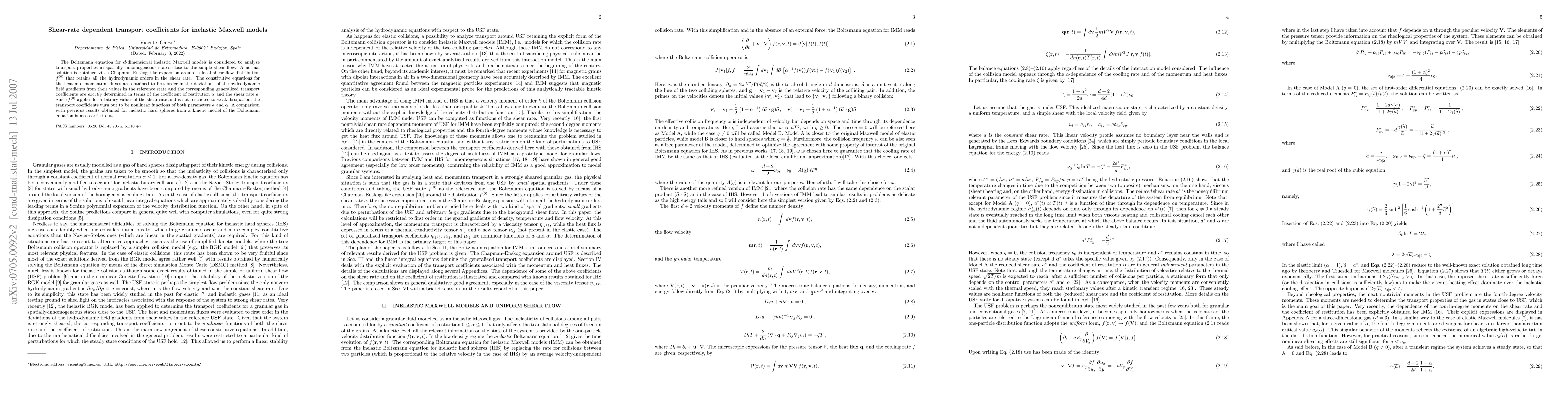 This paper derives shear-rate dependent transport coefficients for inelastic Maxwell models using a Chapman-Enskog-like expansion. The study reveals that these coefficients are nonlinear functions of both the shear rate and the coefficient of restitution, providing a detailed comparison with previous kinetic model results.