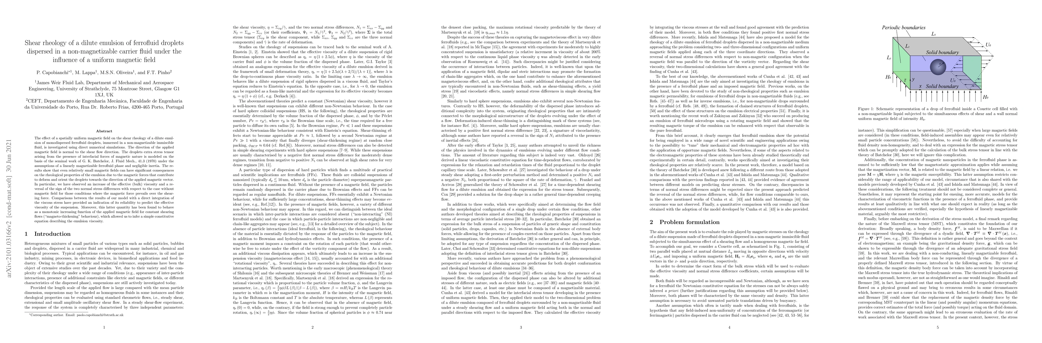 Researchers studied how a uniform magnetic field affects the flow of a suspension of tiny ferrofluid droplets in a non-magnetic fluid, finding that even weak fields can significantly alter the fluid's viscosity and behavior.