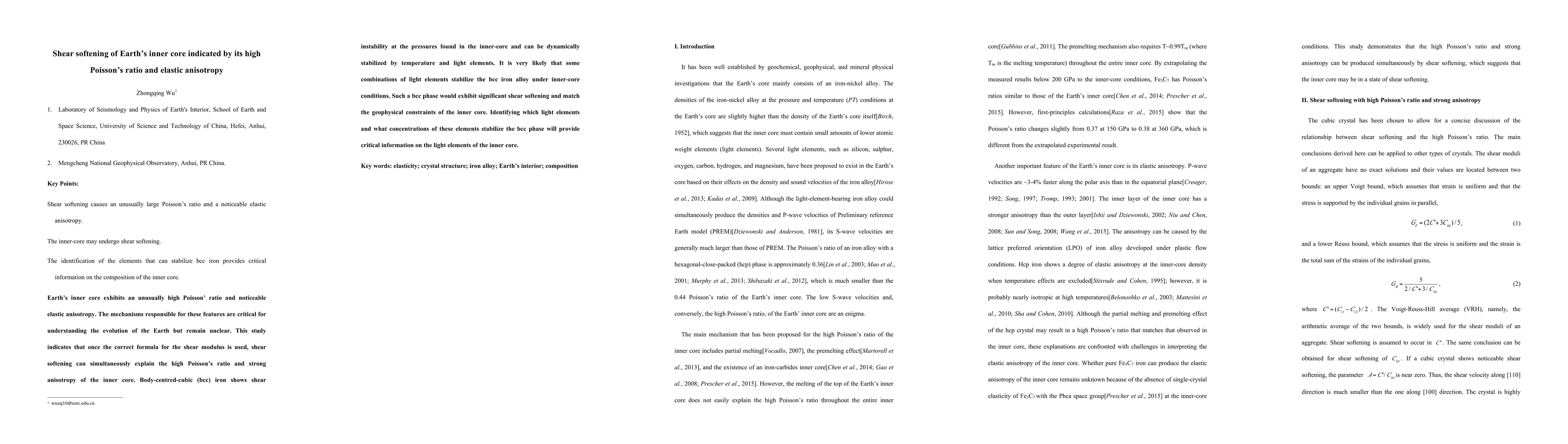 This study suggests that shear softening of Earth's inner core, driven by a combination of temperature and light elements, can explain its high Poisson's ratio and elastic anisotropy. The presence of a body-centred-cubic iron phase stabilized by light elements likely contributes to these geophysical characteristics.