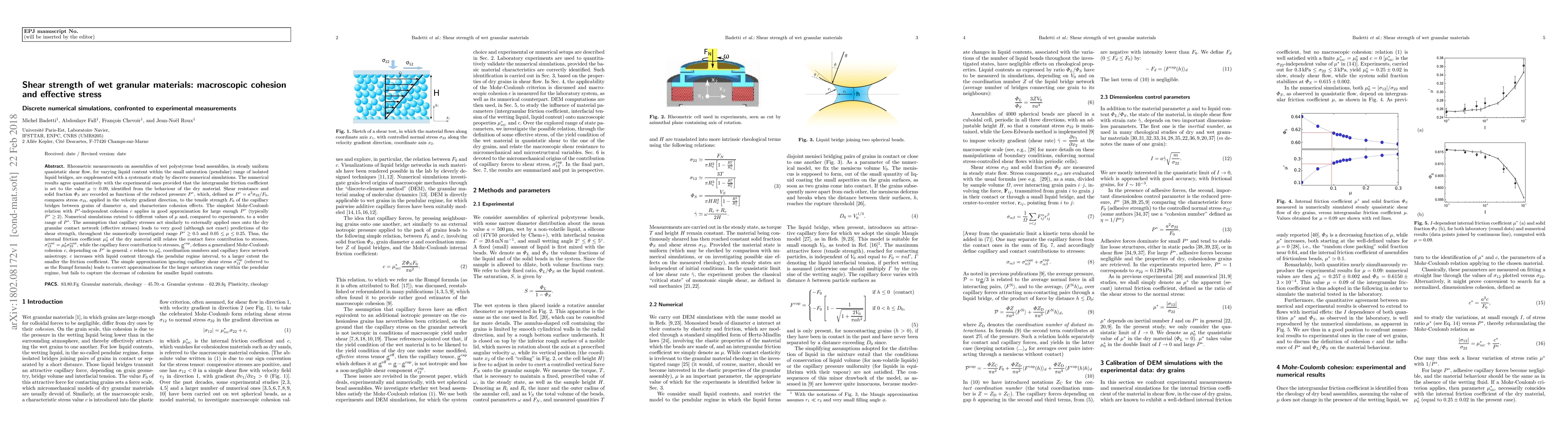 This paper investigates the shear strength of wet granular materials using rheometric measurements and discrete numerical simulations. It finds that the Mohr-Coulomb relation with p-independent cohesion applies well for shear strength predictions, especially when considering effective stress contributions from contact forces.