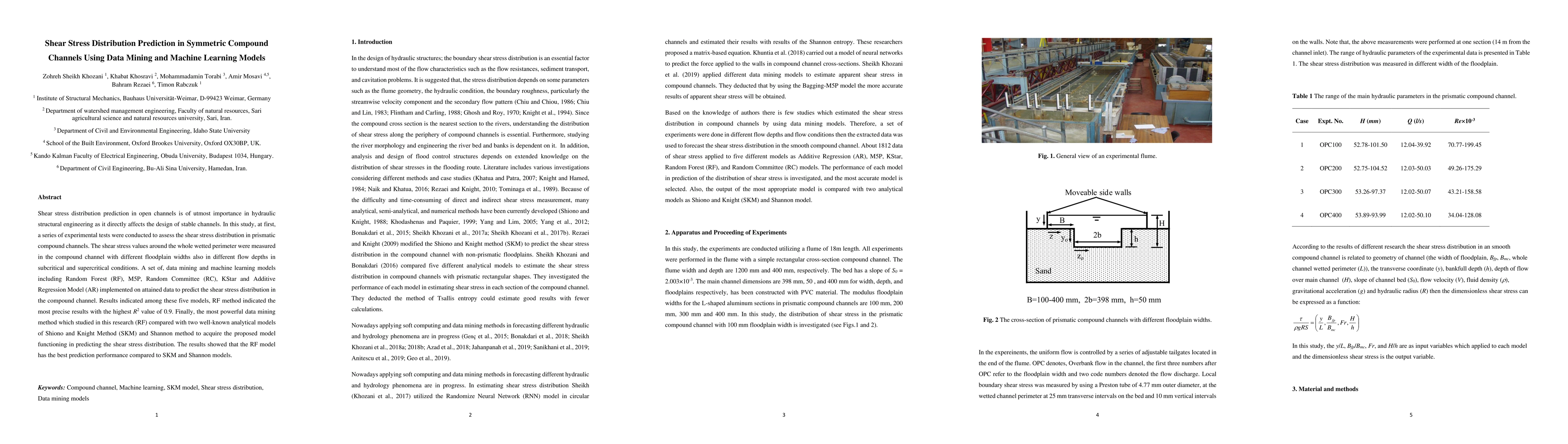 Shear stress distribution prediction in open channels is of utmost importance in hydraulic structural engineering as it directly affects the design of stable channels. In this study, at first, a series of experimental tests were conducted to assess the shear stress distribution in prismatic compound channels. The shear stress values around the whole wetted perimeter were measured in the compound channel with different floodplain widths also in different flow depths in subcritical and supercritical conditions. A set of, data mining and machine learning models including Random Forest (RF), M5P, Random Committee (RC), KStar and Additive Regression Model (AR) implemented on attained data to predict the shear stress distribution in the compound channel. Results indicated among these five models, RF method indicated the most precise results with the highest R2 value of 0.9. Finally, the most powerful data mining method which studied in this research (RF) compared with two well-known analytical models of Shiono and Knight Method (SKM) and Shannon method to acquire the proposed model functioning in predicting the shear stress distribution. The results showed that the RF model has the best prediction performance compared to SKM and Shannon models.