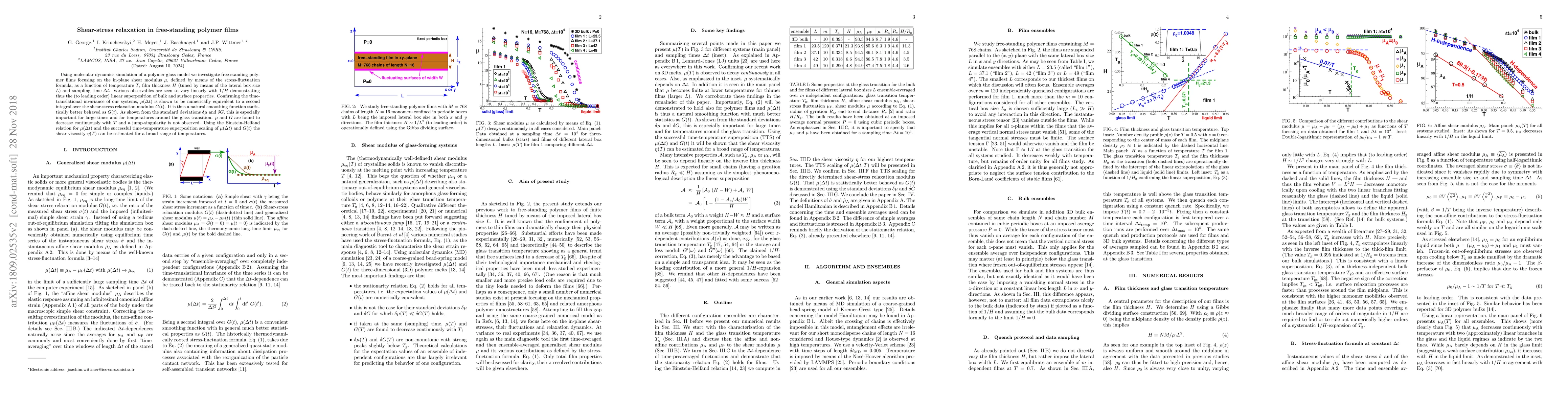 This study, using molecular dynamics simulation, examines free-standing polymer films. It finds that properties like shear modulus and stress relaxation modulus vary linearly with film thickness, showing bulk and surface properties superpose linearly. Both modulus and relaxation modulus decrease continuously with temperature, without observing a sudden jump, confirming time-translational invariance.
