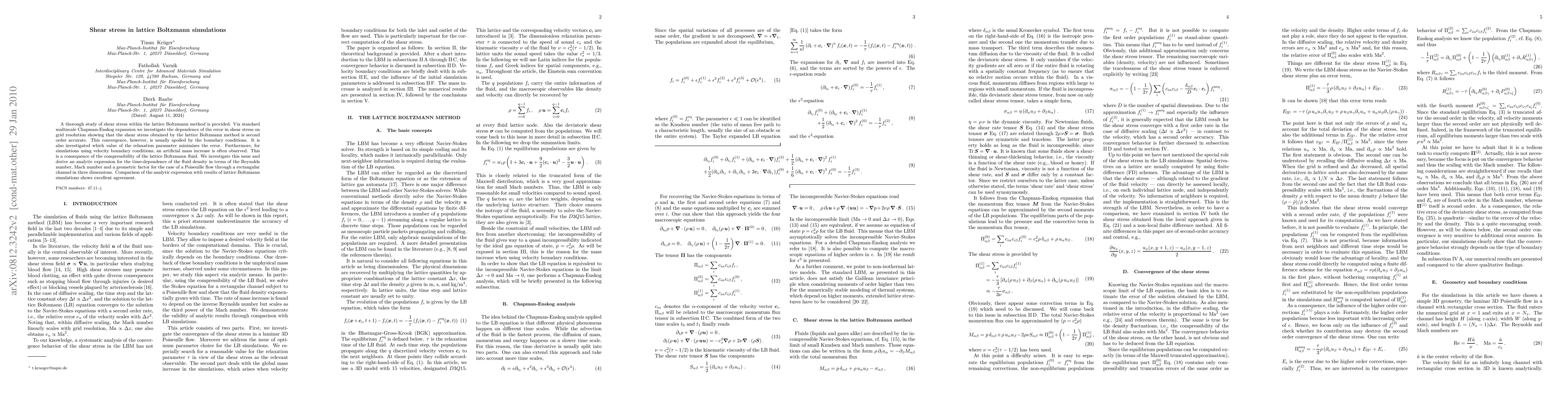 This paper investigates shear stress accuracy in lattice Boltzmann simulations, demonstrating second-order accuracy but noting errors due to boundary conditions. It also addresses artificial mass increase in velocity boundary conditions, deriving an analytic expression for fluid density in Poiseuille flow that aligns well with simulation results.