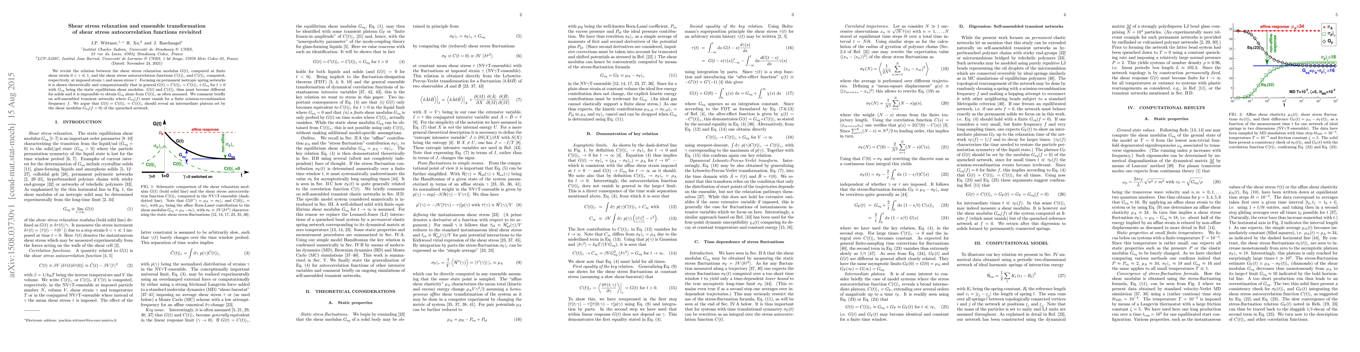 This paper revisits the relationship between shear stress relaxation and autocorrelation functions in permanent isotropic spring networks, showing that $G(t) = C(t)|_{\tau} = C(t)|_{\gamma} + G_{eq}$ for $t > 0$, where $G_{eq}$ is the static equilibrium shear modulus. It concludes that $G_{eq}$ cannot be obtained solely from $C(t)|_{\gamma}$ and discusses transient networks where $G_{eq}(f)$ vanishes at a finite frequency $f$.