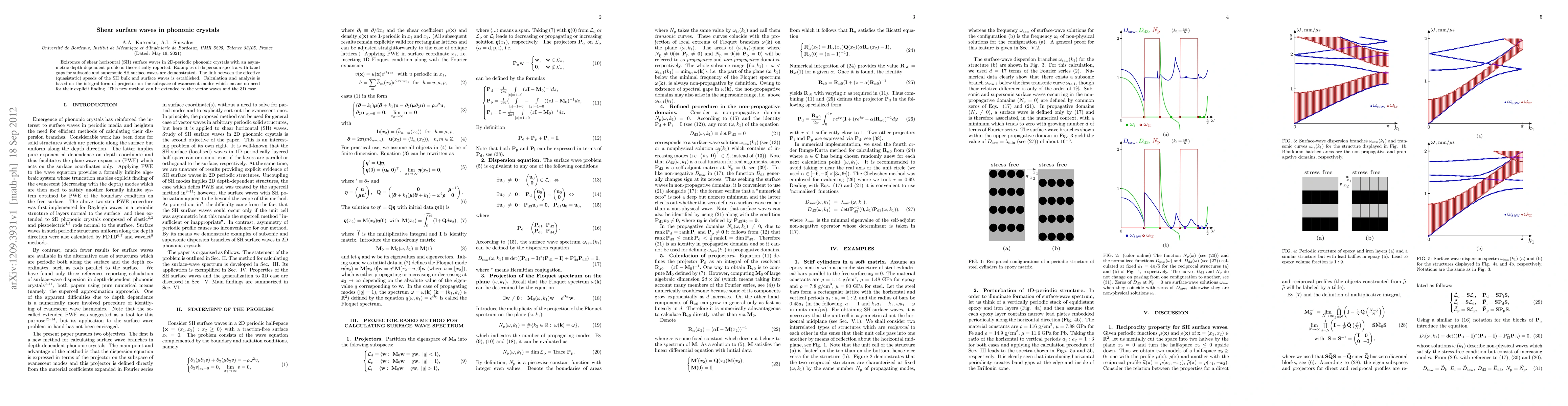 Existence of shear horizontal (SH) surface waves in 2D-periodic phononic crystals with an asymmetric depth-dependent profile is theoretically reported. Examples of dispersion spectra with band gaps for subsonic and supersonic SH surface waves are demonstrated. The link between the effective (quasistatic) speeds of the SH bulk and surface waves is established. Calculation and analysis is based on the integral form of projector on the subspace of evanescent modes which means no need for their explicit finding. This new method can be extended to the vector waves and the 3D case.