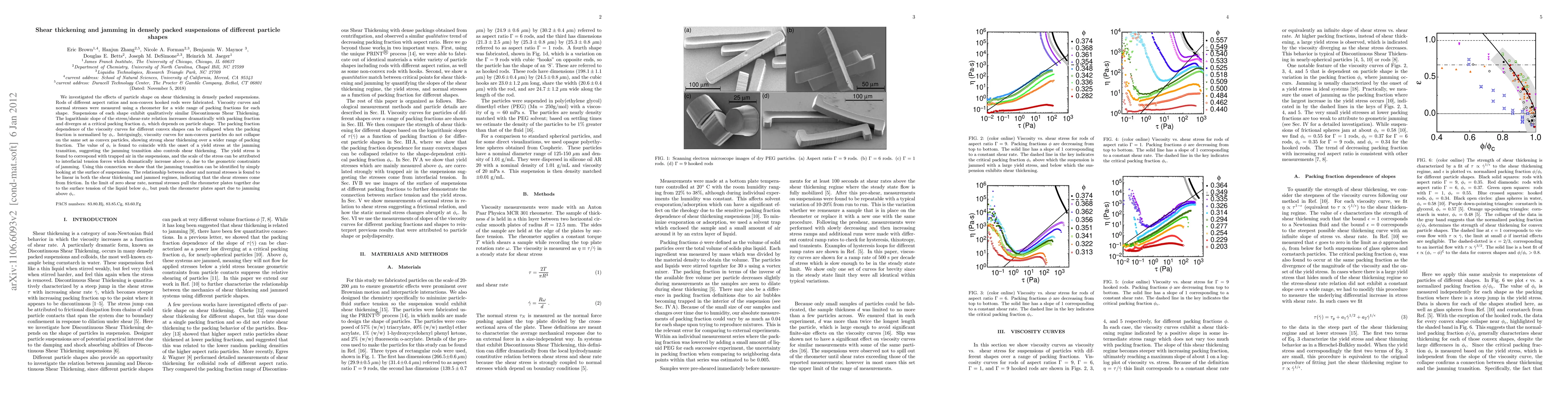 We investigated the effects of particle shape on shear thickening in densely packed suspensions. Rods of different aspect ratios and non-convex hooked rods were fabricated. Viscosity curves and normal stresses were measured using a rheometer for a wide range of packing fractions for each shape. Suspensions of each shape exhibit qualitatively similar Discontinuous Shear Thickening. The logarithmic slope of the stress/shear-rate relation increases dramatically with packing fraction and diverges at a critical packing fraction phi_c which depends on particle shape. The packing fraction dependence of the viscosity curves for different convex shapes can be collapsed when the packing fraction is normalized by phi_c. Intriguingly, viscosity curves for non-convex particles do not collapse on the same set as convex particles, showing strong shear thickening over a wider range of packing fraction. The value of phi_c is found to coincide with the onset of a yield stress at the jamming transition, suggesting the jamming transition also controls shear thickening. The yield stress is found to correspond with trapped air in the suspensions, and the scale of the stress can be attributed to interfacial tension forces which dramatically increase above phi_c due to the geometric constraints of jamming. The relationship between shear and normal stresses is found to be linear in both the shear thickening and jammed regimes, indicating that the shear stresses come from friction. In the limit of zero shear rate, normal stresses pull the rheometer plates together due to the surface tension of the liquid below phi_c, but push the rheometer plates apart due to jamming above phi_c.