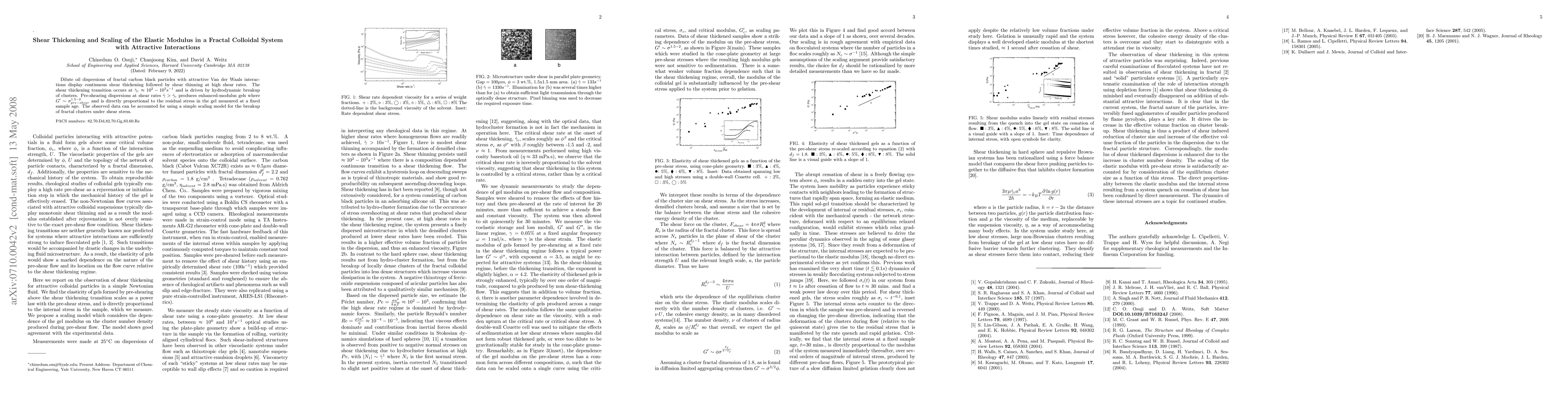This paper investigates the shear thickening behavior in dilute oil dispersions of fractal carbon black particles, showing a transition to shear thinning at high shear rates. Pre-shearing enhances the elastic modulus of the gel, scaling proportionally to the residual stress, and a simple scaling model explains the breakup of fractal clusters under shear stress.