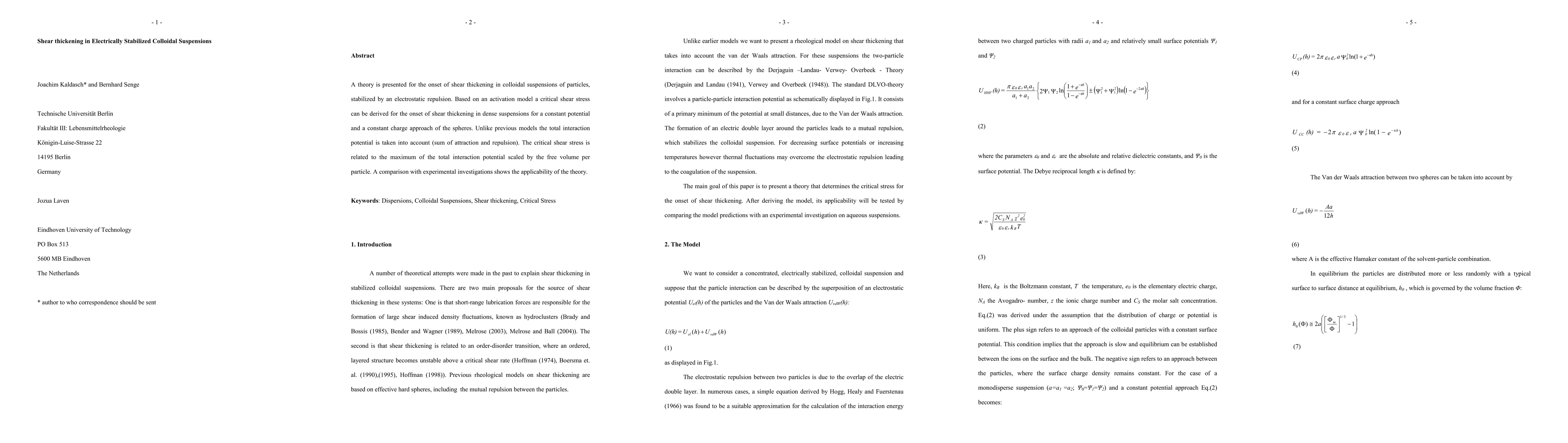 This paper proposes a new theoretical model explaining the onset of shear thickening in electrostatically stabilized colloidal suspensions, deriving a critical shear stress based on the total interaction potential. The model is validated through comparison with experimental data.
