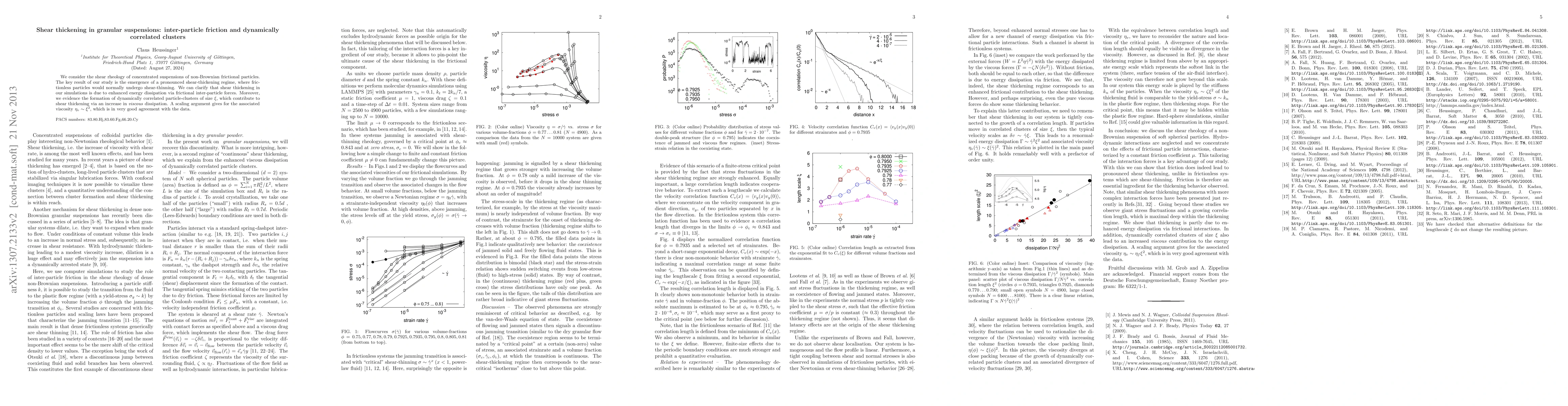 This study investigates the shear rheology of concentrated suspensions of non-Brownian, frictional particles, revealing a shear-thickening regime driven by inter-particle friction and enhanced energy dissipation. The formation of dynamically correlated clusters contributes to shear thickening through increased viscous dissipation, with a scaling relation $\eta\sim \xi^2$ matching experimental data.