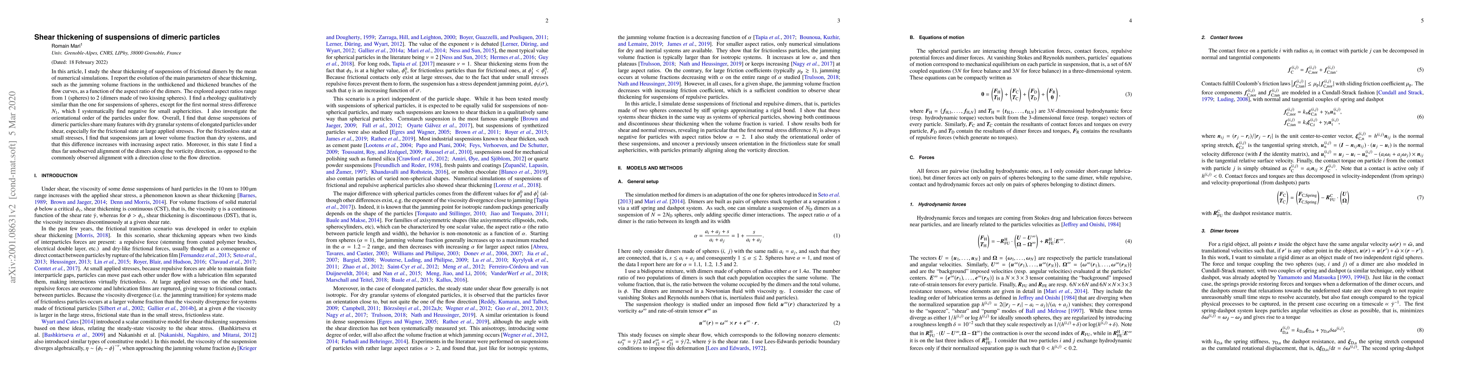 Research on suspensions of dimeric particles reveals similarities to dry granular systems, especially at high stresses, with new findings including alignment along vorticity direction in frictionless state.