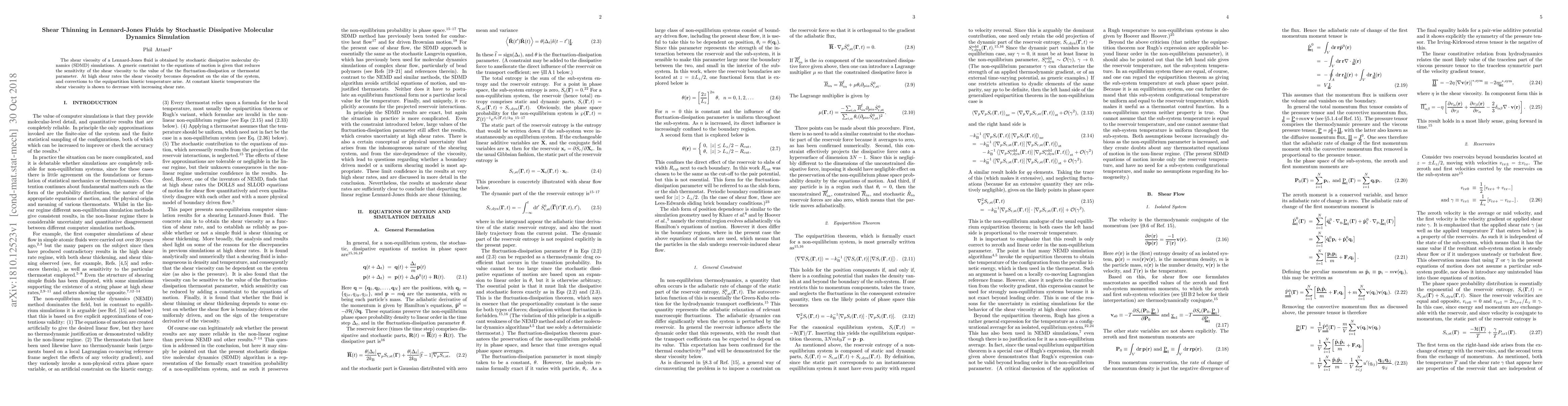 This study uses stochastic dissipative molecular dynamics simulations to investigate shear viscosity in Lennard-Jones fluids, revealing shear thinning behavior where viscosity decreases with increasing shear rate. The simulations incorporate a constraint to minimize sensitivity to thermostat parameters, highlighting system size effects at high shear rates.