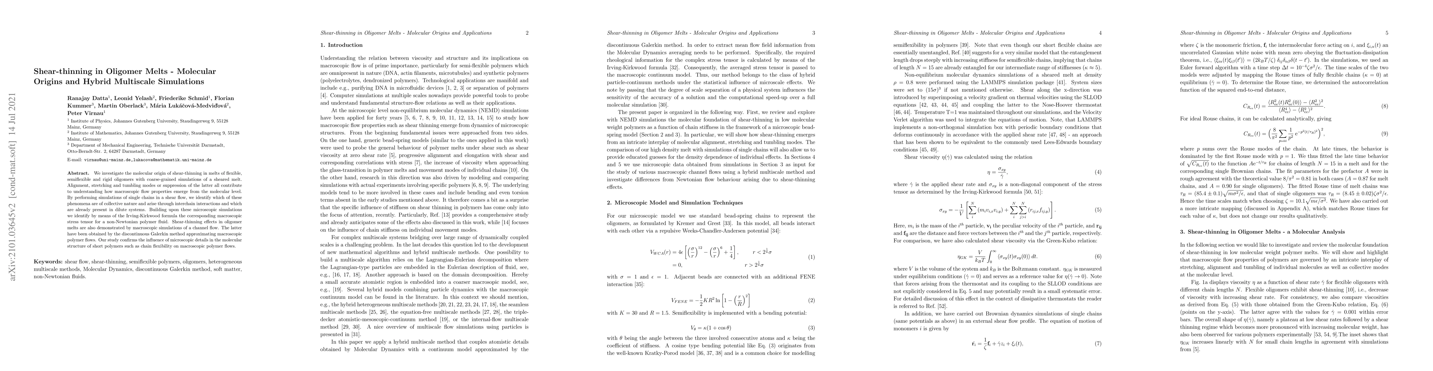 This paper explores the molecular origins of shear-thinning in polymer melts using coarse-grained simulations, identifying alignment, stretching, and tumbling as key contributors. It combines microscopic simulations with macroscopic modeling to demonstrate the impact of polymer chain flexibility on macroscopic flow properties.