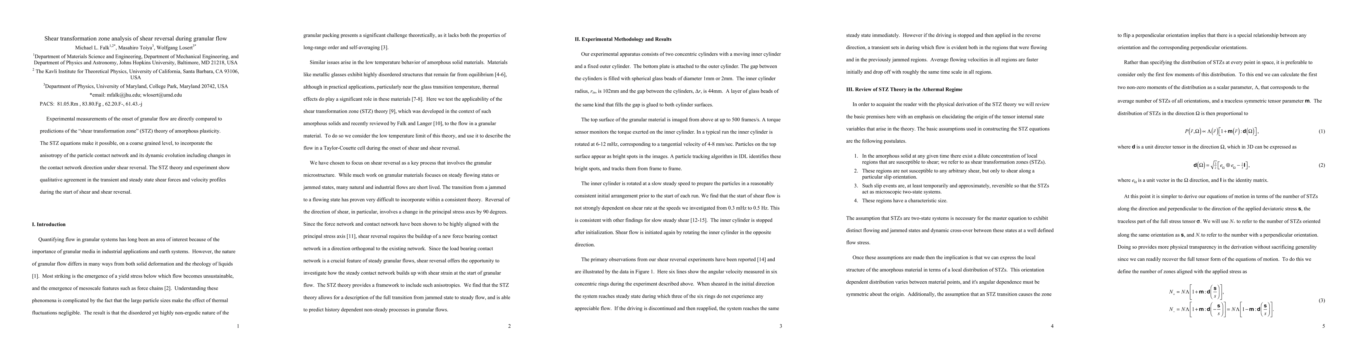 This paper compares experimental granular flow data with predictions from the shear transformation zone (STZ) theory, showing qualitative agreement in shear forces and velocity profiles during shear and its reversal, highlighting the theory's ability to account for particle contact network anisotropy and its dynamic changes.