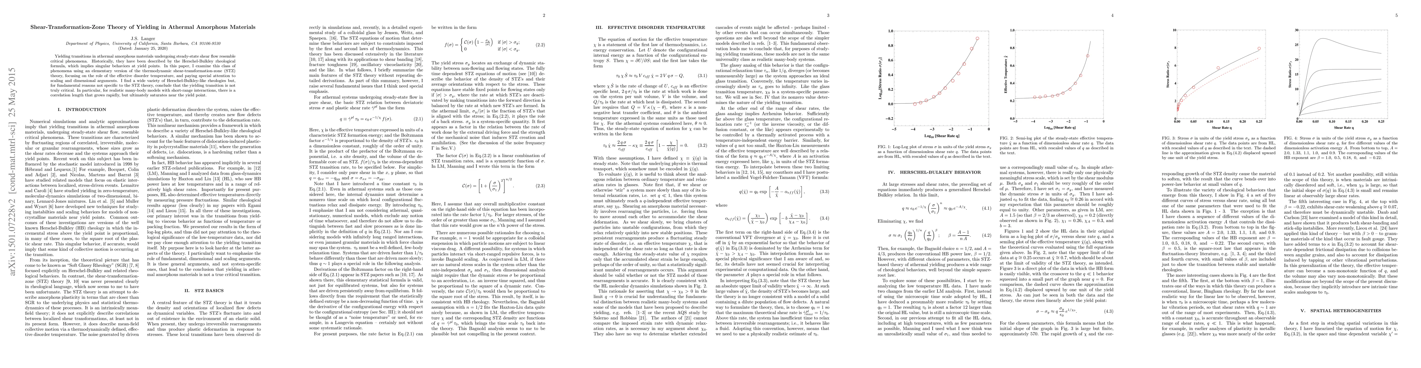 Yielding transitions in athermal amorphous materials resemble critical phenomena. Historically, they have been described by the Herschel-Bulkley rheological formula, which implies singular behaviors at yield points. In this paper, I examine this class of phenomena using an elementary version of the thermodynamic shear-transformation-zone (STZ) theory, focusing on the role of the effective disorder temperature, and paying special attention to scaling and dimensional arguments. I find a wide variety of Herschel-Bulkley-like rheologies but, for fundamental reasons not specific to the STZ theory, conclude that the yielding transition is not truly critical. In particular, there is a correlation length that grows rapidly, but ultimately saturates near the yield point.