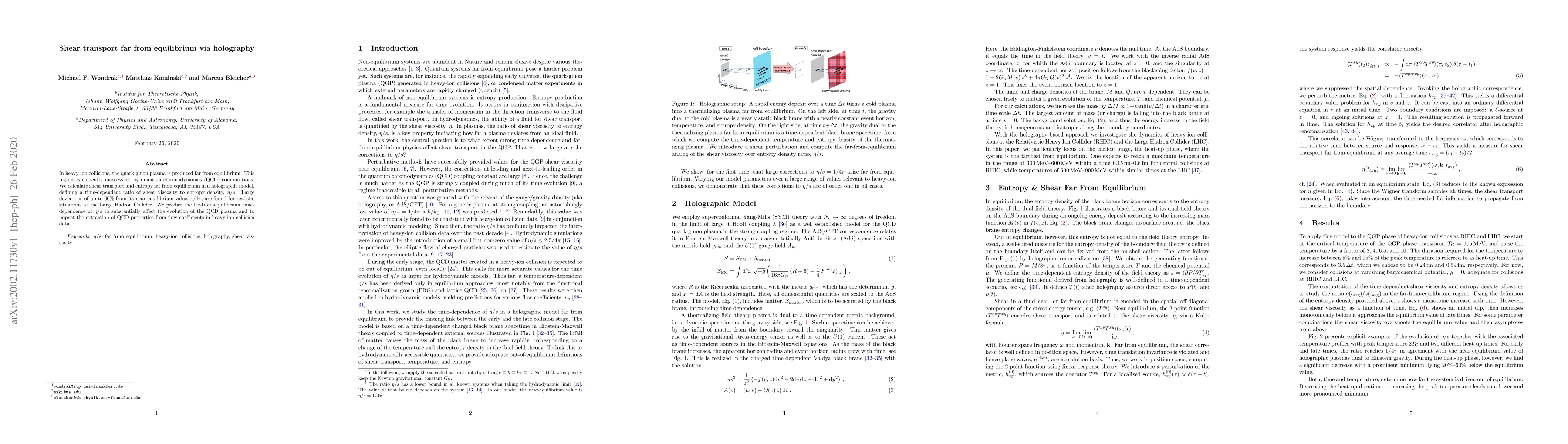 This paper investigates shear transport in quark-gluon plasma produced in heavy-ion collisions using a holographic model, finding significant deviations from equilibrium values of the shear viscosity to entropy density ratio, $\eta/s$. These deviations could notably influence the evolution of the plasma and the interpretation of QCD properties from heavy-ion collision data.