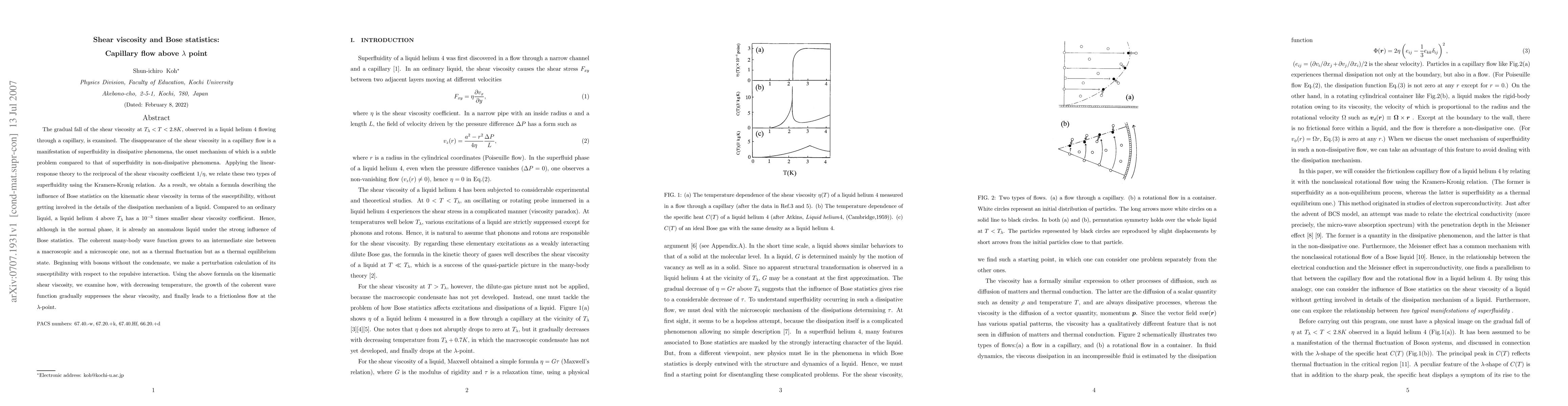 This paper investigates the reduction of shear viscosity in liquid helium 4 below 2.8K during capillary flow, attributing it to superfluidity. It uses linear-response theory and Bose statistics to show how superfluidity in dissipative phenomena relates to non-dissipative superfluidity, ultimately demonstrating that liquid helium 4 above the lambda point exhibits significantly reduced shear viscosity due to the influence of Bose statistics.