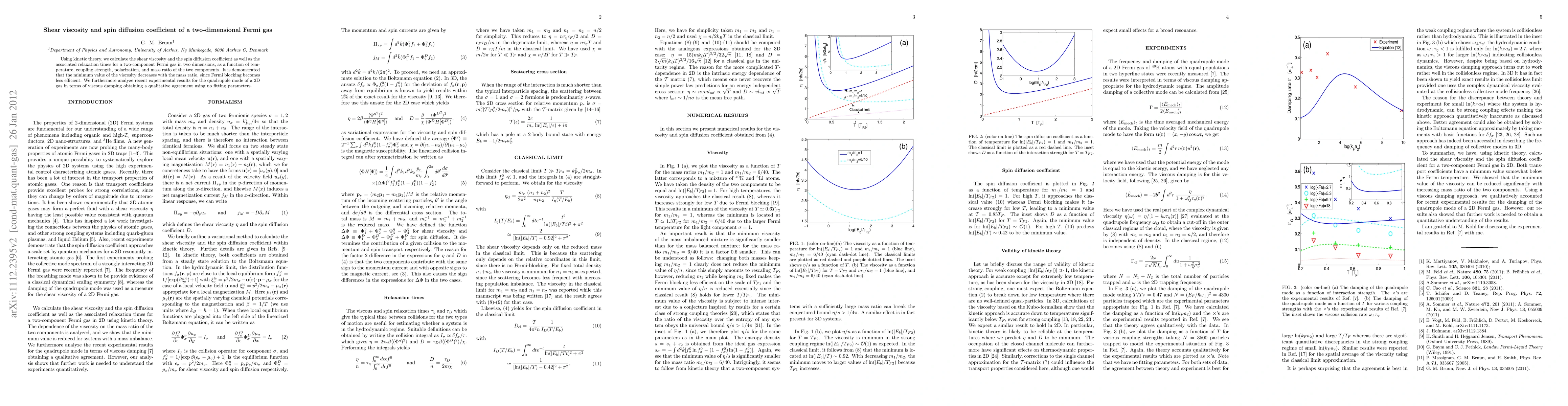 The paper presents detailed calculations for shear viscosity and spin diffusion coefficient in 2D Fermi gases using kinetic theory, providing expressions for relaxation times and analyzing their dependence on various parameters.