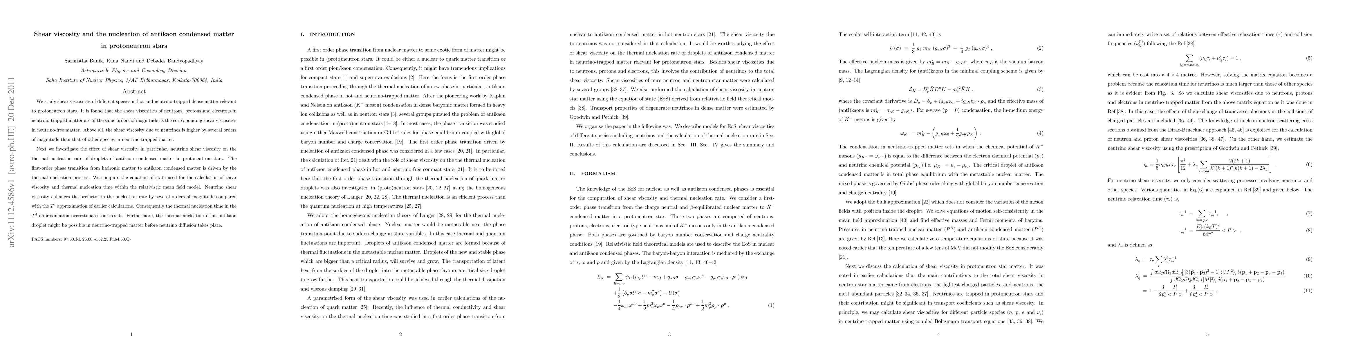 This paper investigates shear viscosities in dense, neutrino-trapped matter in protoneutron stars, finding that neutrino shear viscosity is significantly higher than that of other species. It also examines how this viscosity affects the nucleation of antikaon condensed matter, showing that neutrino shear viscosity greatly enhances the nucleation rate, leading to a much shorter thermal nucleation time than previously estimated.