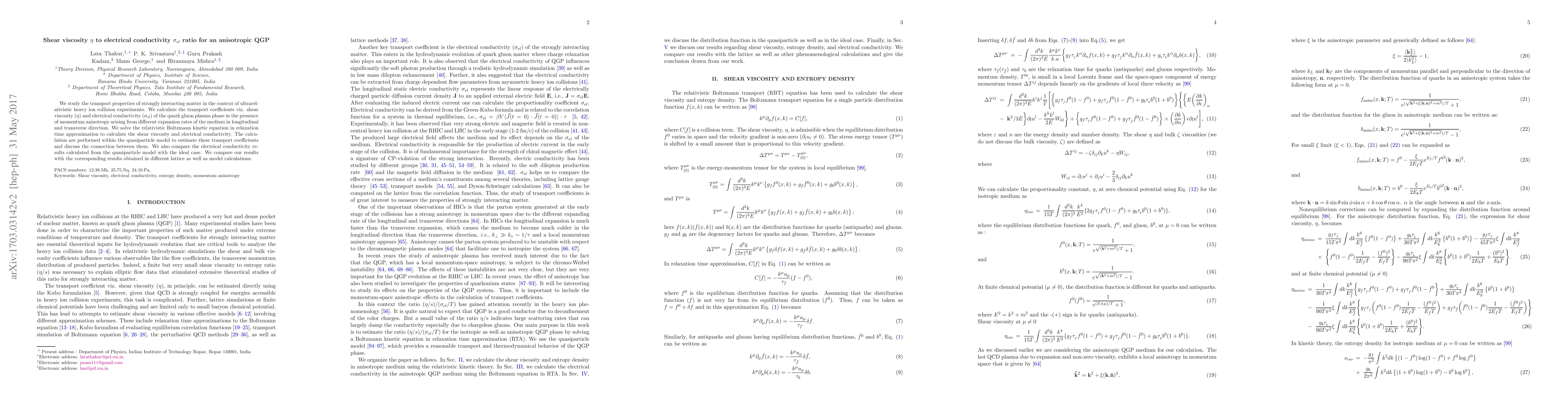 This paper investigates the transport properties of quark-gluon plasma (QGP) in anisotropic conditions, calculating shear viscosity and electrical conductivity using the relativistic Boltzmann kinetic equation and quasiparticle model. It discusses the ratio of shear viscosity to electrical conductivity and compares results with lattice and model calculations.