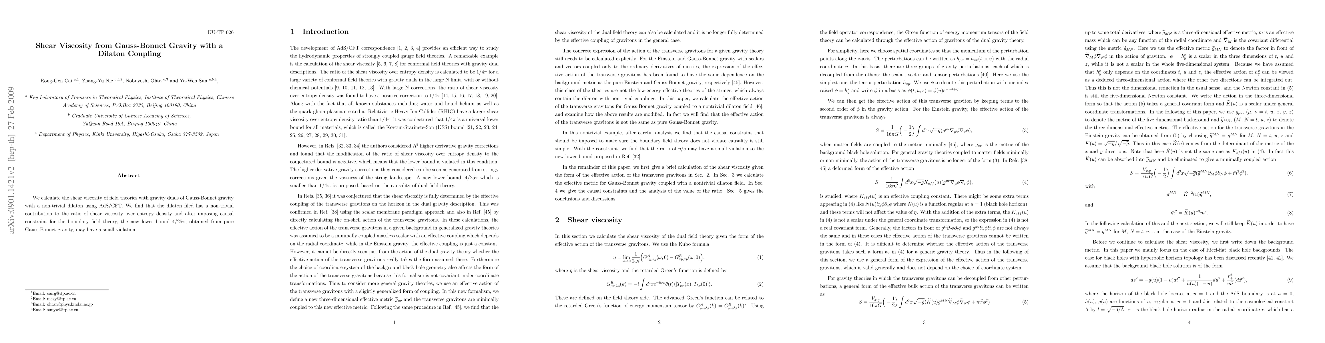 This paper calculates the shear viscosity of field theories with Gauss-Bonnet gravity and a dilaton coupling using AdS/CFT correspondence, revealing a non-trivial dilaton contribution to the viscosity-to-entropy ratio, and suggests a potential small violation of the lower bound $4/25\pi$ for the ratio.