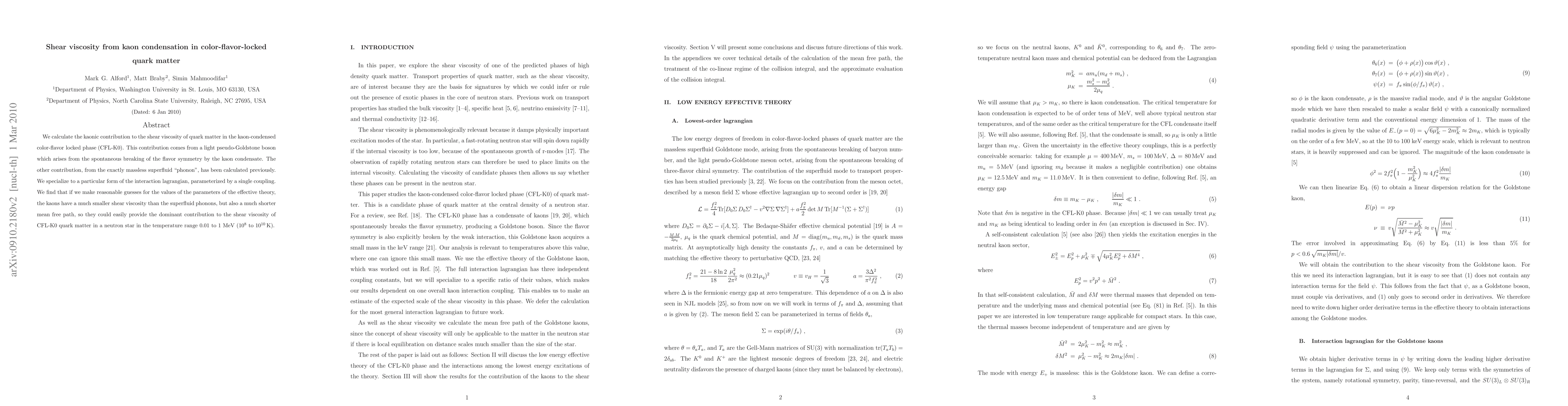 This paper calculates the shear viscosity contribution from kaon condensation in color-flavor-locked quark matter, finding that kaons, despite having a smaller viscosity than superfluid phonons, could dominate the overall shear viscosity due to their shorter mean free path in neutron star temperatures.