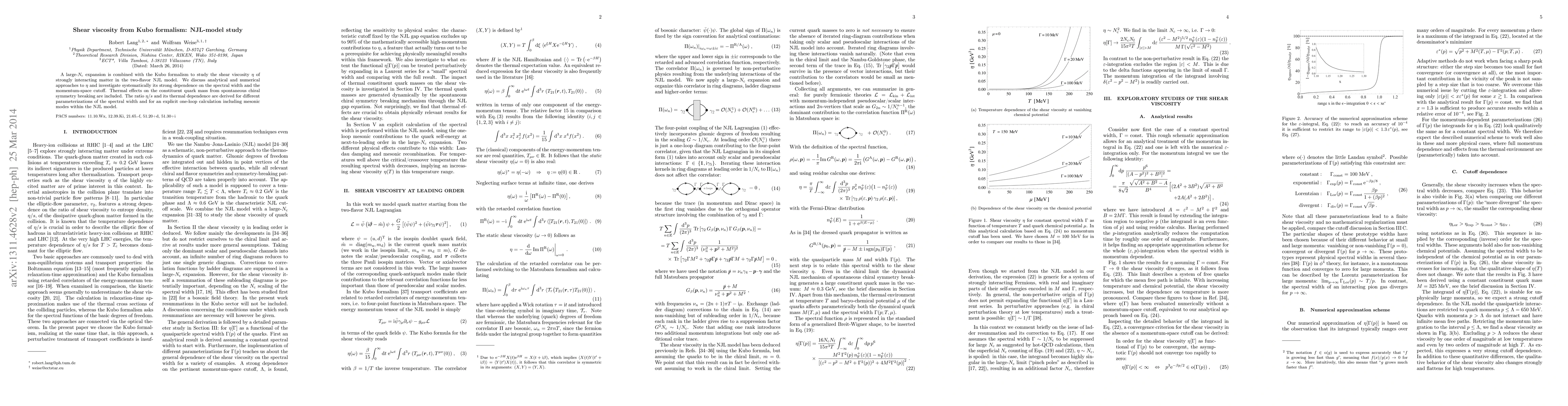 This paper combines a large-$N_{\rm c}$ expansion with the Kubo formalism to analyze the shear viscosity $\eta$ in the two-flavor NJL model, focusing on its dependence on spectral width and momentum cutoff. It derives the $\eta/s$ ratio, considering thermal effects from spontaneous chiral symmetry breaking and exploring its thermal dependence.