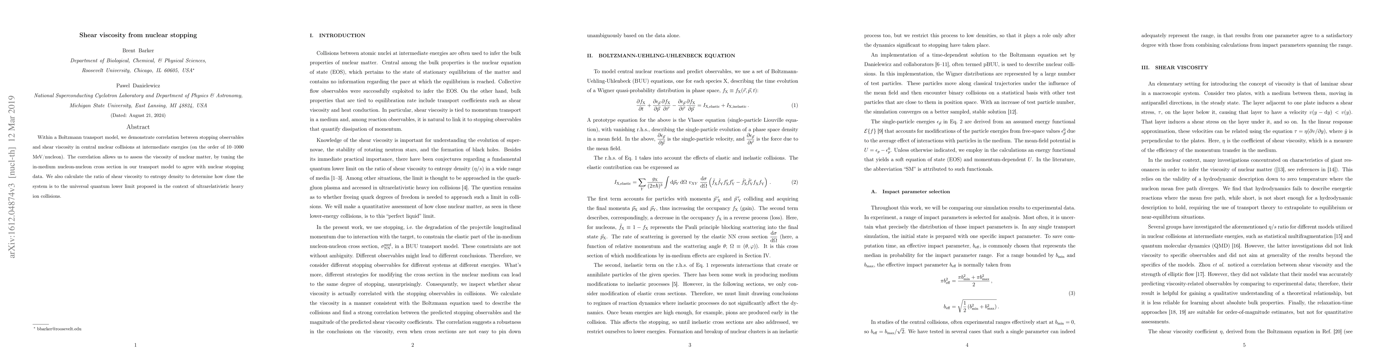 The paper presents a method to estimate shear viscosity from nuclear stopping data using a Boltzmann transport model, and demonstrates that in-medium nucleon-nucleon cross section reduction is necessary to match experimental observations.