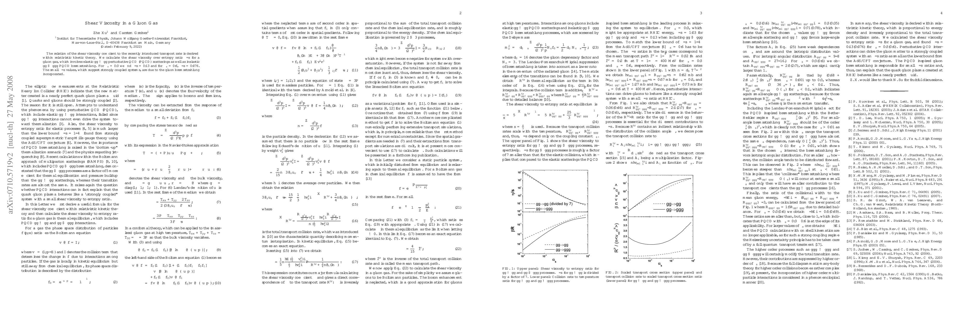 This paper derives the shear viscosity coefficient in a gluon gas using relativistic kinetic theory, finding \eta/s=0.13 for \alpha_s=0.3 and \eta/s=0.076 for \alpha_s=0.6, indicating strongly coupled systems due to gluon bremsstrahlung.