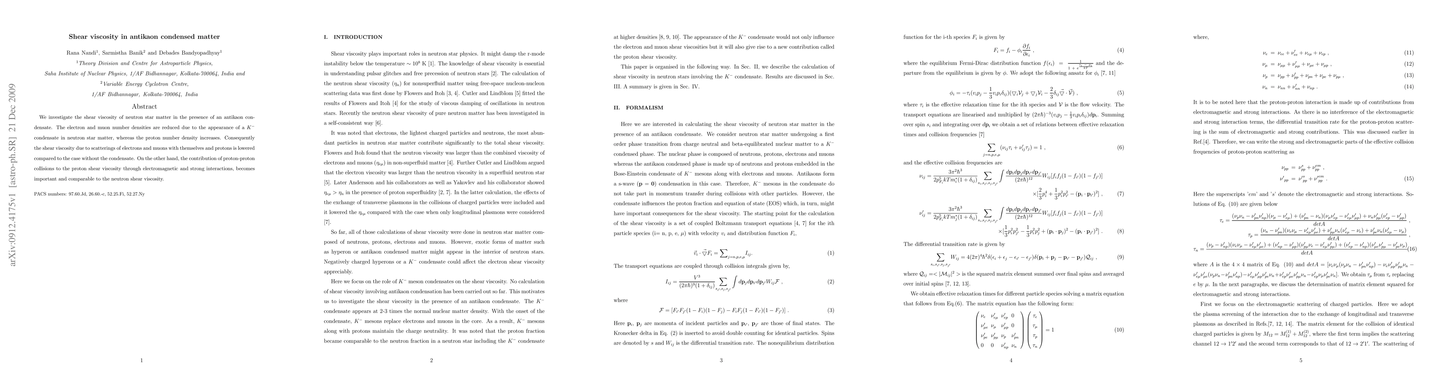 This paper examines the shear viscosity in neutron star matter containing an antikaon condensate, finding that the presence of $K^-$ reduces electron and muon densities while increasing proton density, thus lowering overall shear viscosity due to electron and muon scatterings, but enhancing proton-proton collision contributions.