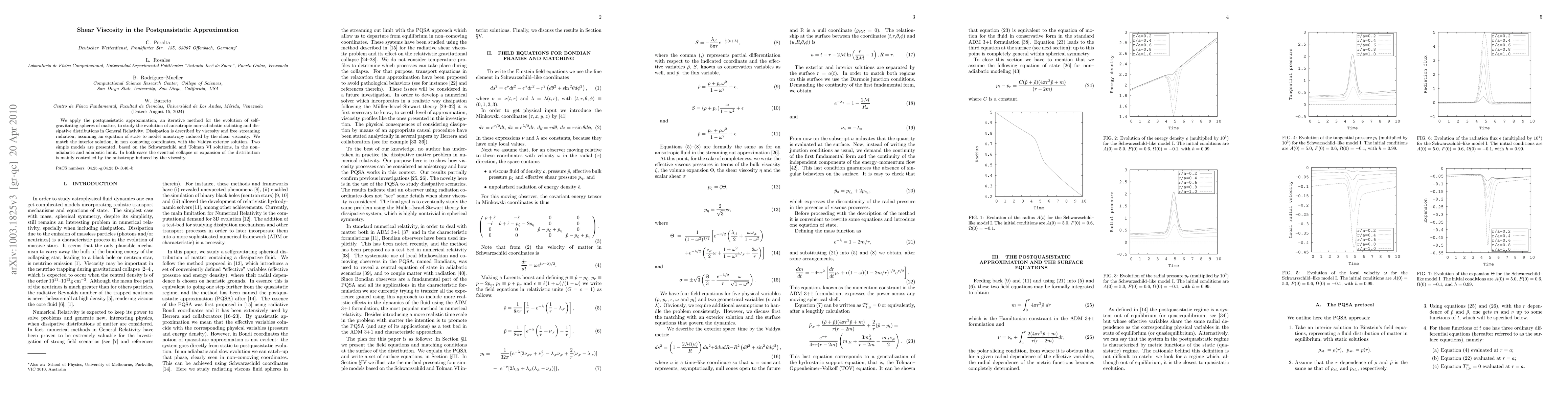 This paper applies the post-quasistatic approximation to study the evolution of anisotropic, non-adiabatic radiating and dissipative distributions in General Relativity, focusing on the role of shear viscosity in determining the eventual collapse or expansion of self-gravitating spheres. The study matches interior solutions with the Vaidya exterior solution, using models based on Schwarzschild and Tolman VI solutions.