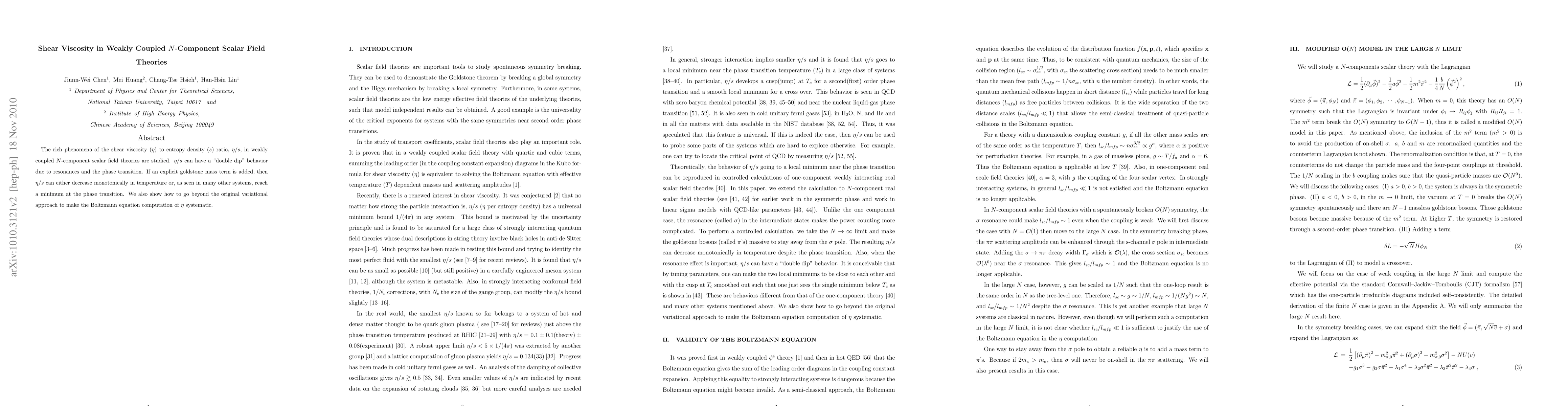 The rich phenomena of the shear viscosity (eta) to entropy density (s) ratio, eta/s, in weakly coupled N-component scalar field theories are studied. eta/s can have a "double dip" behavior due to resonances and the phase transition. If an explicit goldstone mass term is added, then eta/s can either decrease monotonically in temperature or, as seen in many other systems, reach a minimum at the phase transition. We also show how to go beyond the original variational approach to make the Boltzmann equation computation of eta systematic.